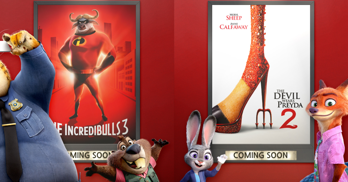 為了此次宣傳,迪士尼發布了一系列極具創意的惡搞海報,巧妙地結合方城市的動物主題,更向多部DISNEY與PIXAR製作中的電影續作致敬,不僅有《超人特攻隊3》、《穿著prada的惡魔2》,就連阿凡達也被改成驚恐的長頸鹿!此系列海報也偷偷預告了第二集將登場的角色!超可愛的跨界聯動,也讓粉絲直呼房間也想貼一張!