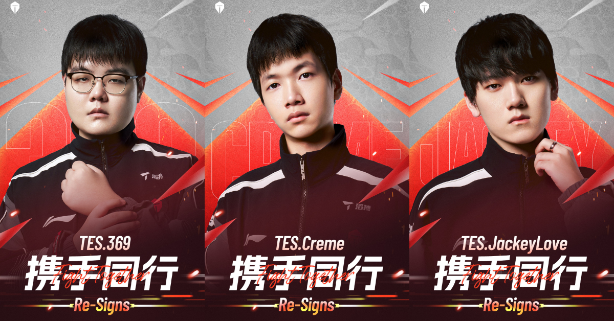 好在今日稍早,TES 官方已於微博宣布續約上路選手 369、中路選手 Creme 以及下路選手 JackeyLove。