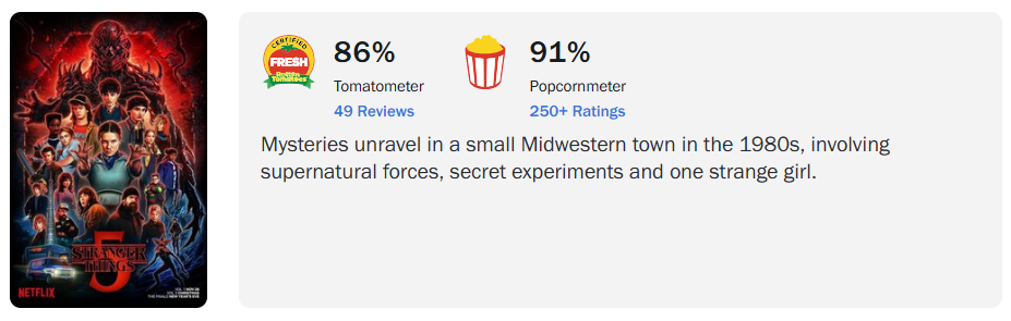 • 《怪奇物語》第五季(2025):爛番茄新鮮度 86%、觀眾爆米花指數 91%