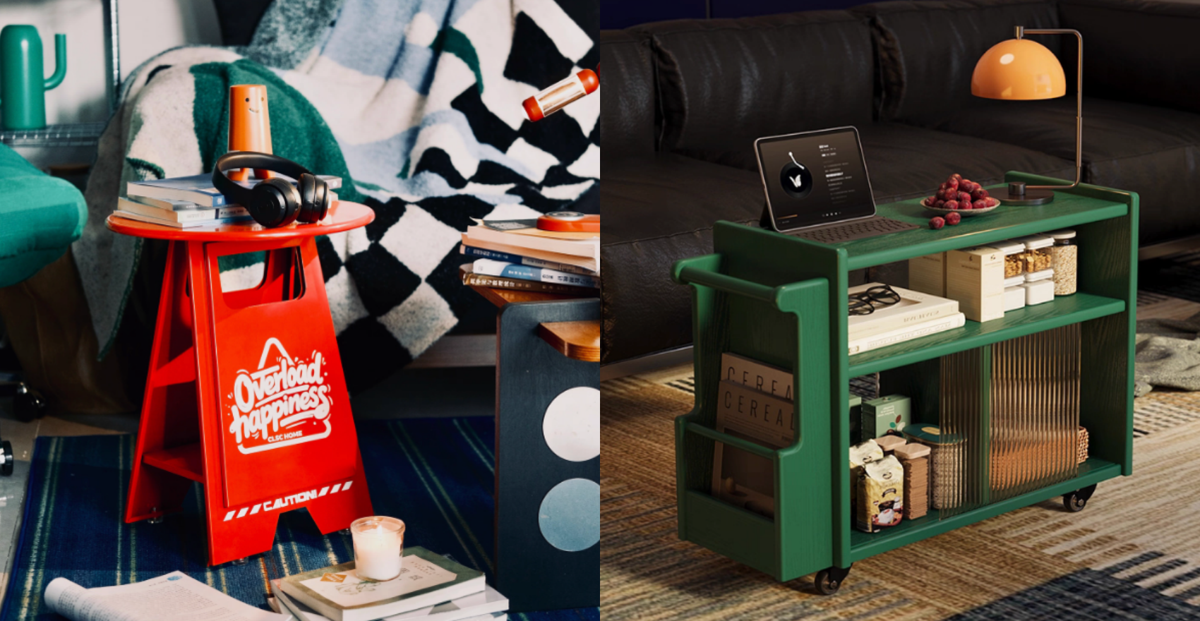 這個耍廢小角落,不只是放鬆的空間更應該是個人風格的延伸,可以點綴一點設計感兼具實用性的小桌,同時搞定擺設和收納,像這兩款紅色的俏皮工具風小桌可以當邊桌也能當擺飾;綠色復古收納桌更是筆電、零食、小物都能一併搞定,實用又好看,小角落立刻升級!