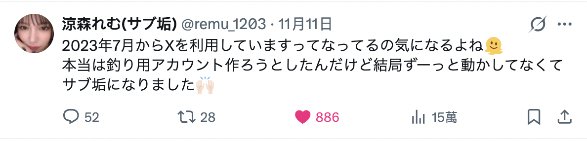 然而,雖說在多元領域都締造精彩佳績,但礙於著個人 X(Twitter)主帳號被官方 shadow ban 的緣由,便令她重新啟用了另外一個子帳號。有趣的是,該子帳號才使用不到一個月的狀況下,就吸引 “破萬人” 追蹤外,涼森玲夢 更逗趣寫下「本当は釣り用アカウント作ろうとしたんだけど結局ずーっと動かしてなくてサブ垢になりました(意即:本來是想經營一個釣魚專用帳號的,結果從 2023 年後完全沒動過,就變成純粹的備用帳號了)」的話語關係,驚喜吐露出自己私下愛釣魚的個性。