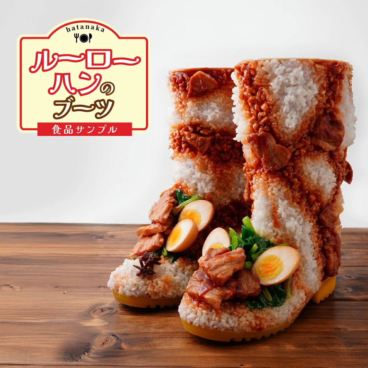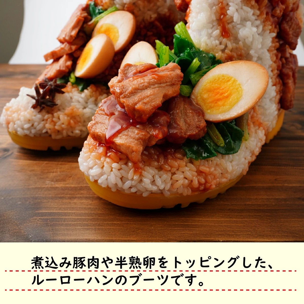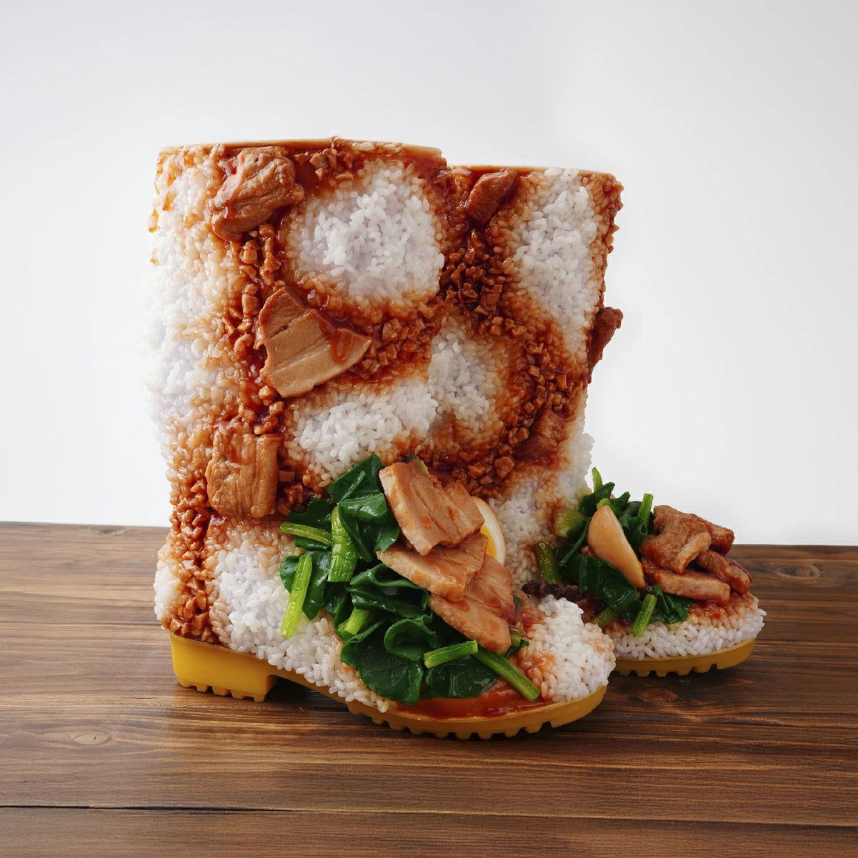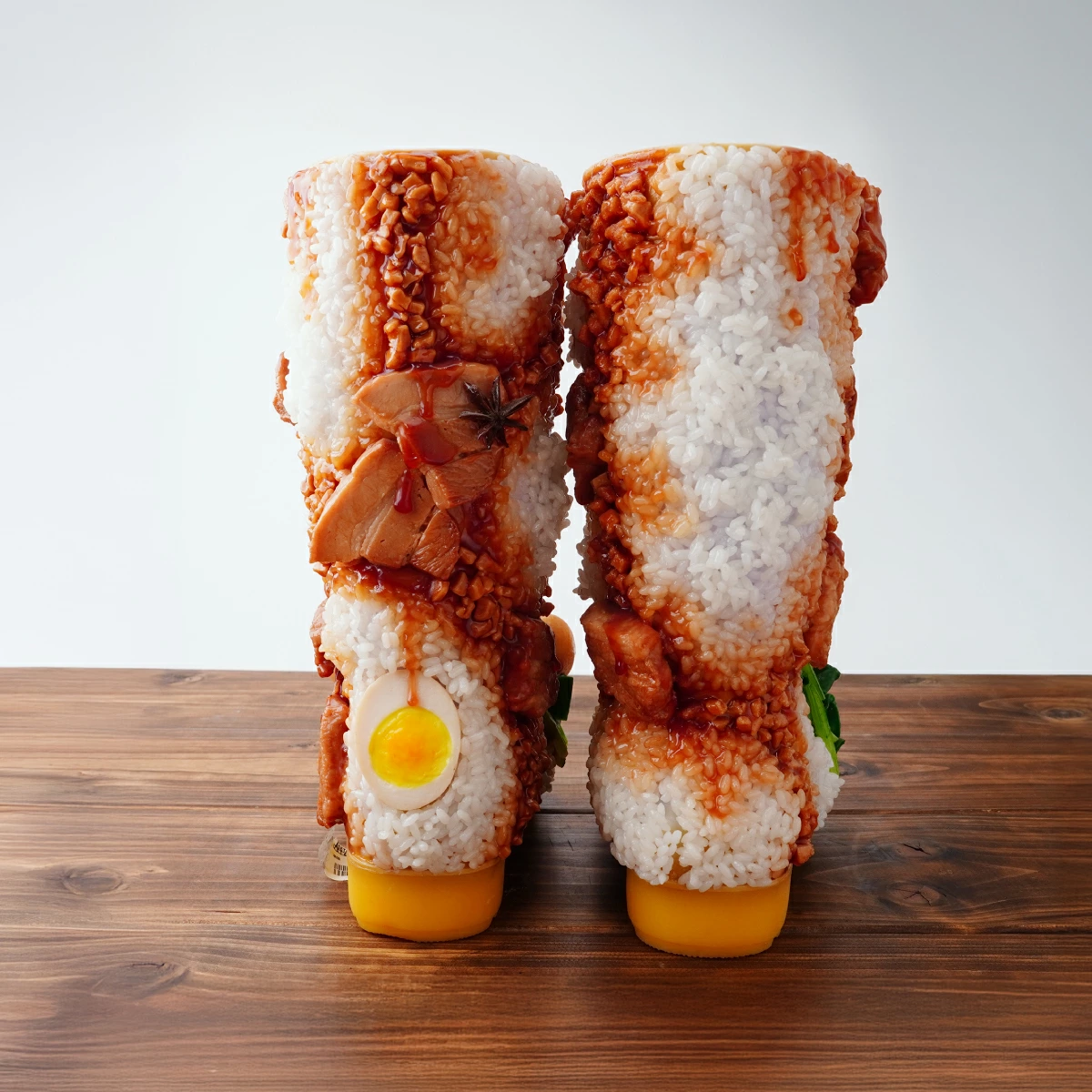 「白飯底層→滷肉→滷汁→滷蛋→青菜→八角」全都原汁原味直接呈現在靴子表面,逼真程度宛如剛從便當店直接拿去黏上去。所使用的是日本傳統的「食品模型技術」,每一塊滷肉都油亮到像會滴汁。訂製尺寸從 22.5cm 到 28cm 不等,但官方也提醒:雖然靴子本體很耐穿,但食物外觀裝飾「不太耐磨」,穿太激烈可能會把你的滷肉磨掉。