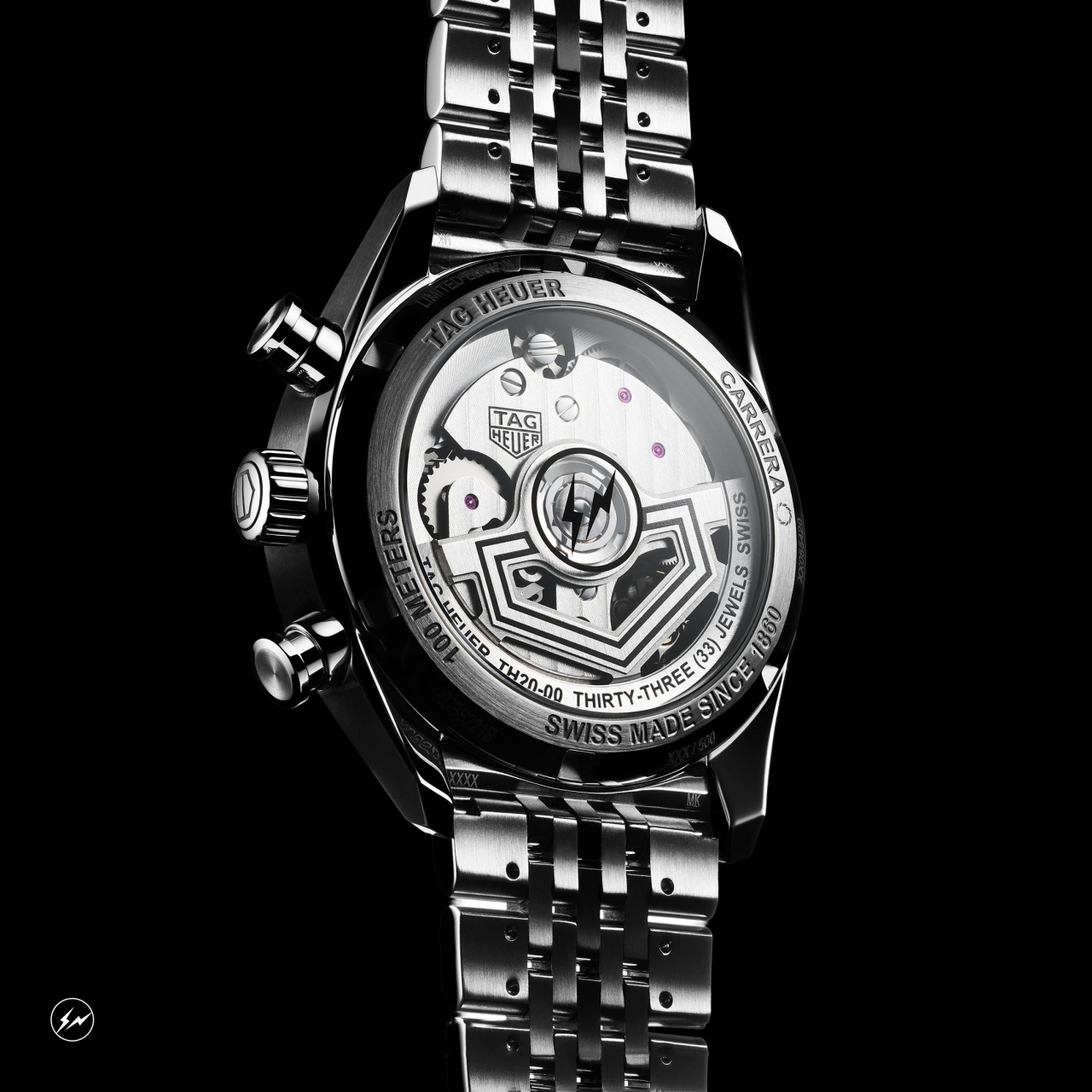腕錶搭載 TAG Heuer 自製 TH20-00 機芯,擁有 80 小時動力儲存與導柱輪+垂直離合結構,運作順暢度與耐用度都屬頂規級別。底蓋可見盾形自動盤與 fragment 標誌,以黑色細節再次呈現藤原浩的設計語彙,讓收藏家一眼就懂其獨特性。全球限量 500 只,並附上黑白對比設計的錶盒與旅行包,從外到內毫不馬虎。