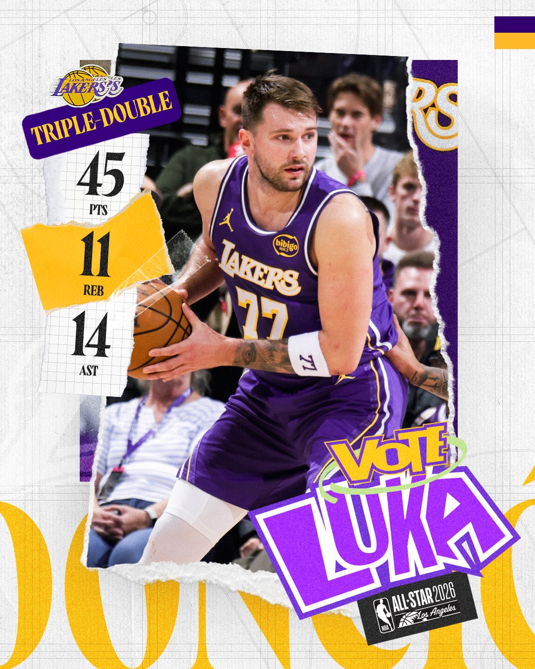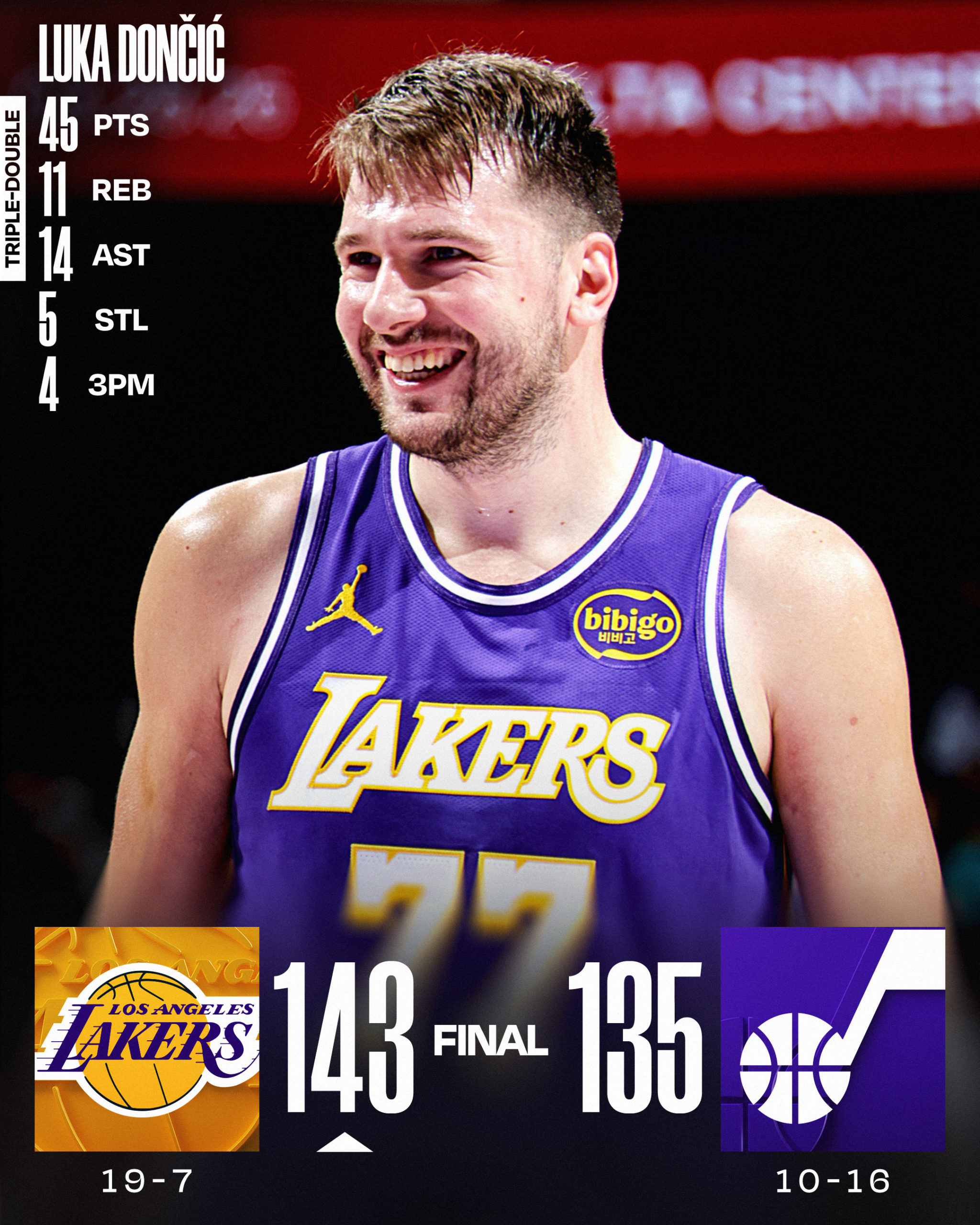 在缺少了明星中鋒 Deandre Ayton 與外線核心 Austin Reaves 的情況下,洛杉磯湖人隊今日在客場展現了令人窒息的進攻天賦。當家球星Luka Doncic 全場暴走,瘋狂轟下 45 分 11 籃板 14 助攻 5 次抄截的大三元數據,帶領湖人以 143:135 擊敗猶他爵士。