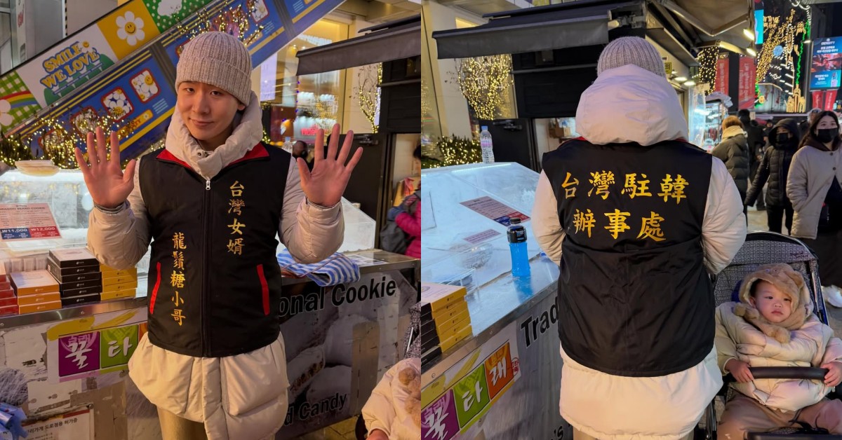 而近日,真的有粉絲將這個玩笑化為現實,特地送上充滿台灣在地特色的「宮廟背心」作為禮物。龍鬚糖小哥也直接在明洞街頭換裝上身,背後印著「台灣駐韓辦事處」的畫面曝光後,立刻在社群引發熱烈討論,網友紛紛笑稱:「根本超合適!」