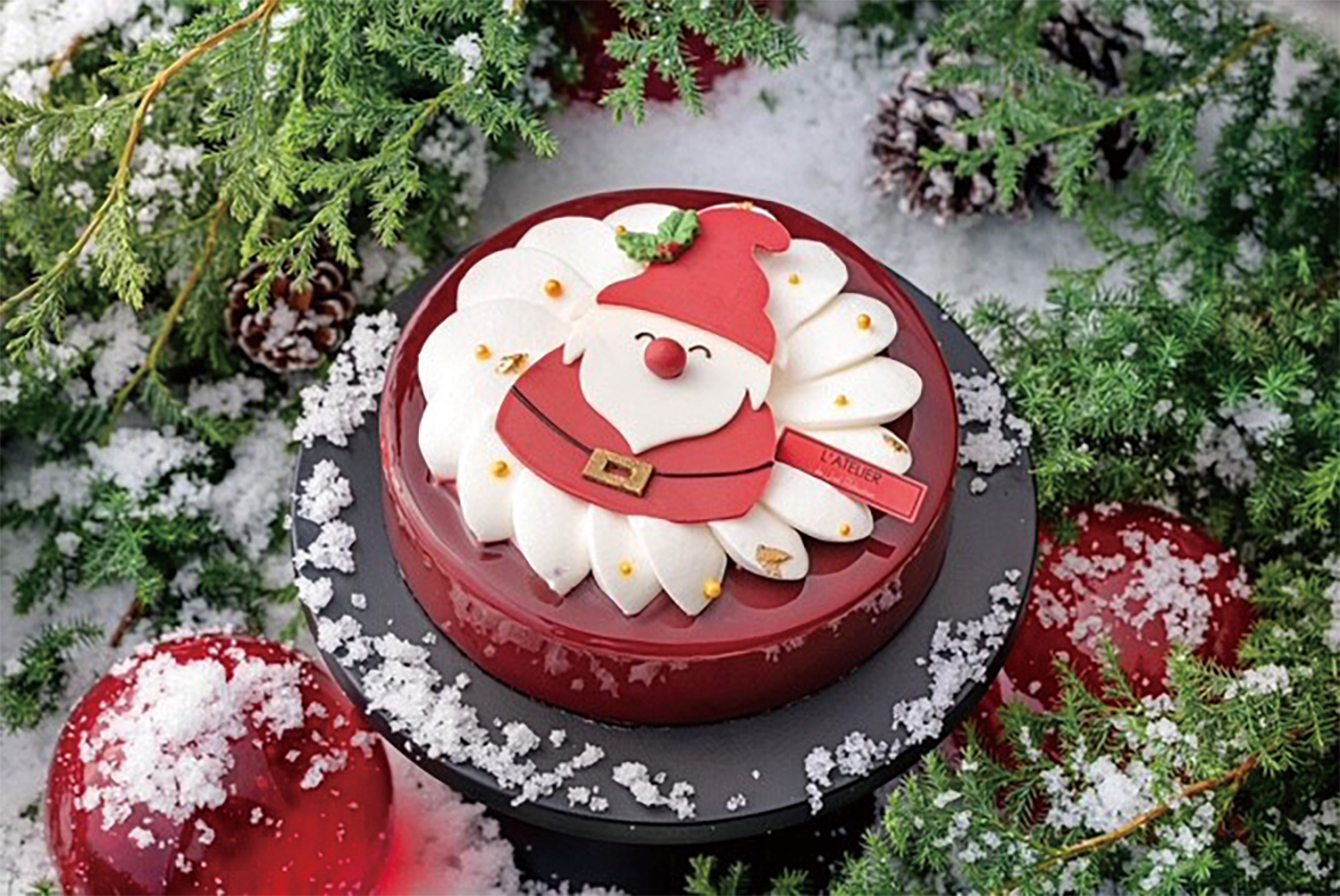 充滿童趣風的紫蘇櫻桃慕斯,耶誕老公公與白色奶霜花瓣形成溫暖又俏皮的視覺焦點,酒紅色光澤襯出節慶氛圍。入口時紫蘇獨特的清香率先在舌尖展開,櫻桃凍的酸甜隨後化開,焦糖核桃脆片帶來香脆驚喜,口感層次豐富。6吋建議售價1,480元,冷藏保存2天。