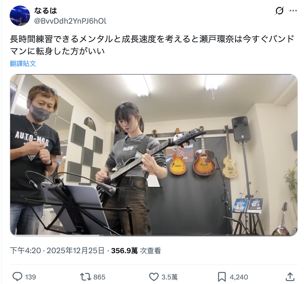 ▲ 有著 “電吉他興趣” 的 瀬戸環奈,因為認真練琴的關係,掀起 X(Twitter)網友的熱烈討論。