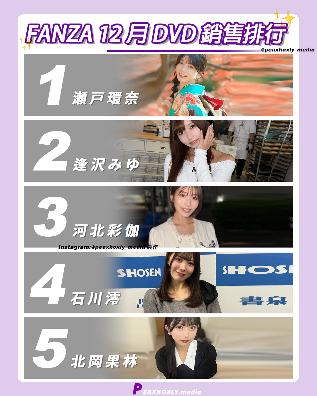 ▲ 日本主流成人影音串流平台 FANZA 正式官宣 12 月份排行,並由「瀬戸環奈」時隔兩個月後再度稱霸 / 圖由性感文化媒體 PEAXHOXLY 製作。
