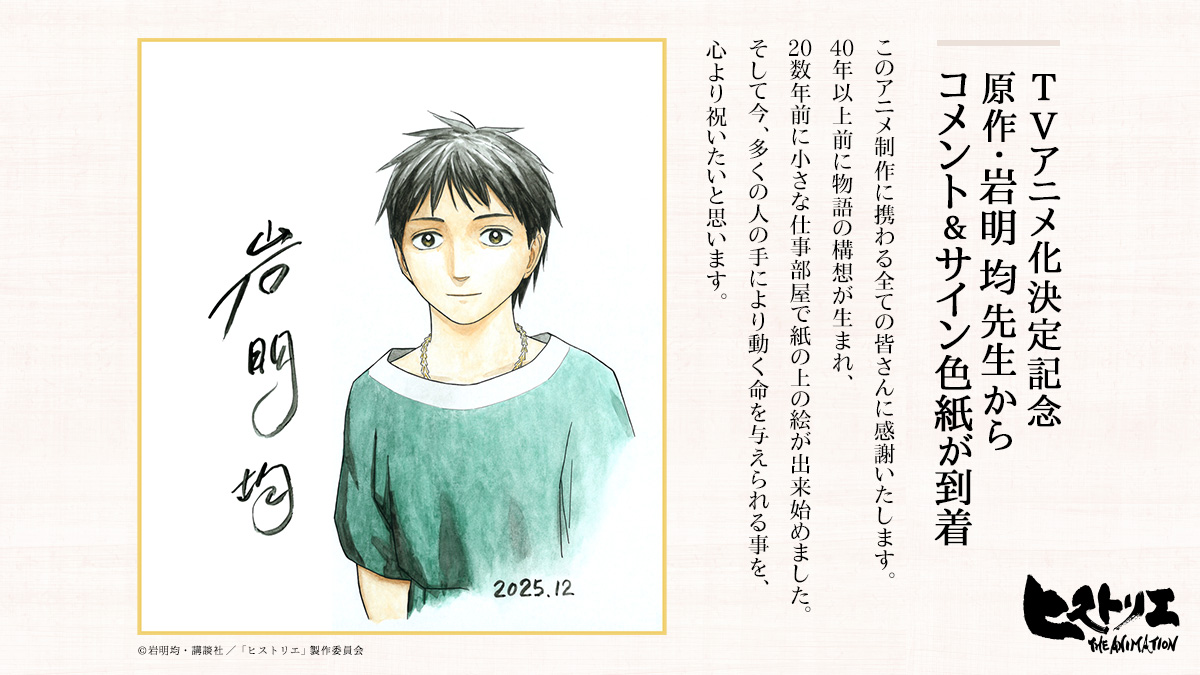 在 1990 年以一部血腥卻深具哲理震撼席捲漫畫界的《寄生獸》轟動全球的日本漫畫家岩明均,在 2026 年首日令大家相當驚喜的宣布了同作者於 2003 年開始連載的作品《歷史之眼》將推出動畫化的消息。消息一出令大家相當震驚,因為漫畫連載迄今速度已算緩慢,讓大家都很好奇原作漫畫會不會不夠做成動畫。