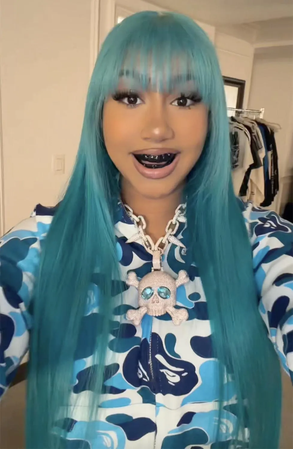 近日,Ye 和 Kim Kardashian 12歲女兒 North West 在 TikTok 上曬新造型!藍色 Bape拉鏈衛衣、全黑牙飾再加上媽媽送的聖誕禮物:106 克拉的鑽石滿鑽骷髏項鍊!