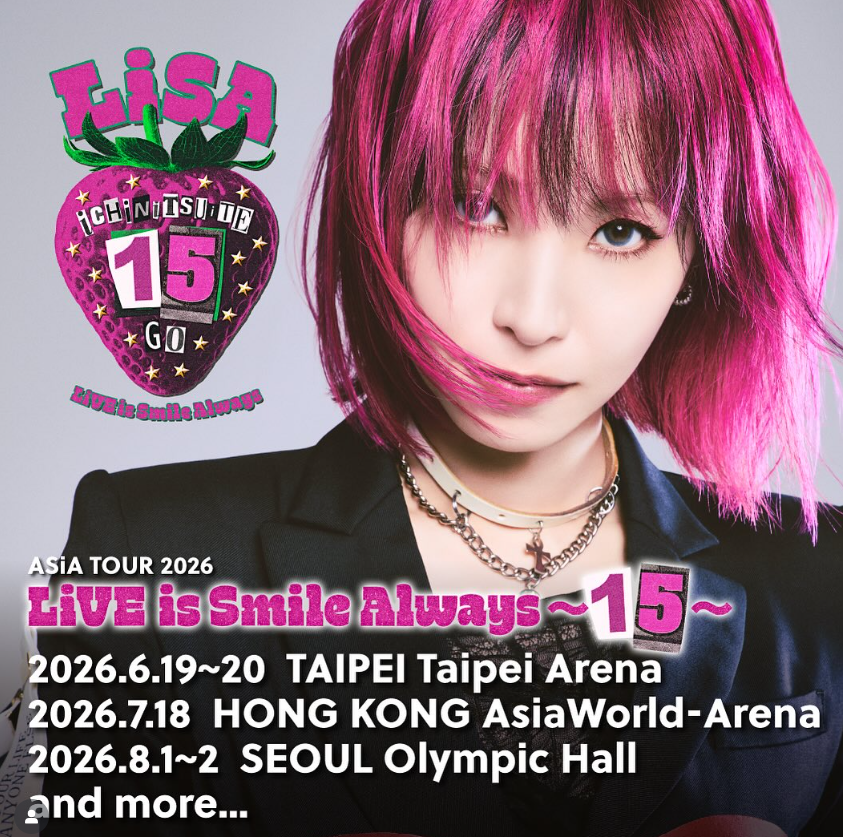 在結束日本國內巡演、並登上 NHK 紅白歌合戰後,LiSA 隨即公布 2026 年亞洲巡演計畫。除了台北場之外,她也將於7月前往香港亞洲國際博覽館(AsiaWorld-Arena)演出,並於 8 月站上首爾奧林匹克廳,與各地歌迷面對面相見。
