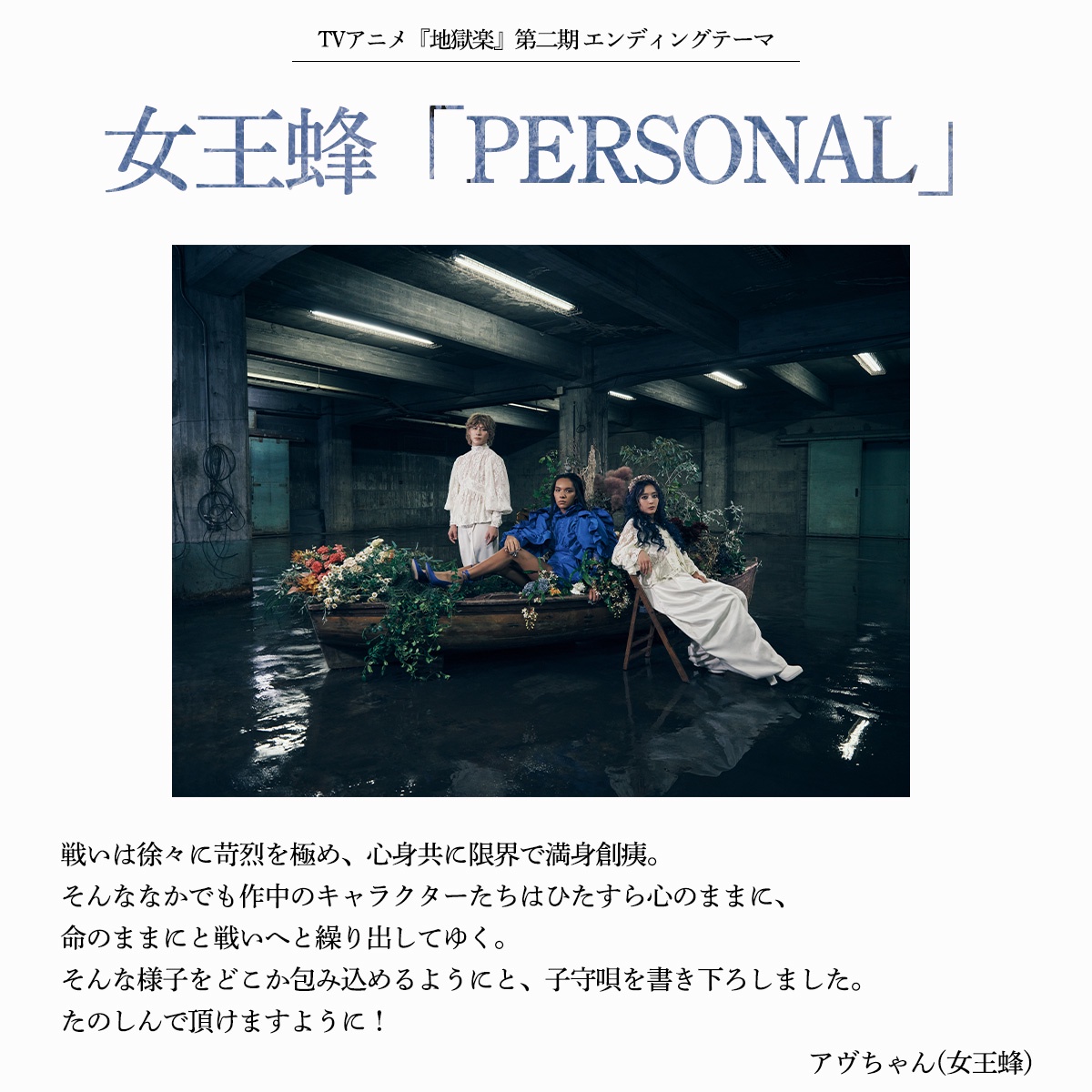 由 MAPPA 製作的改編自賀來友治創作漫畫作品的《地獄樂》第二季動畫將於週日 1 月 11 日正式開播,而官方在開播前也加碼祭出最終第三彈 PV 預告,並公開了本季動畫的 ED 片尾曲〈PERSONAL〉將由搖滾樂團女王蜂所演唱!