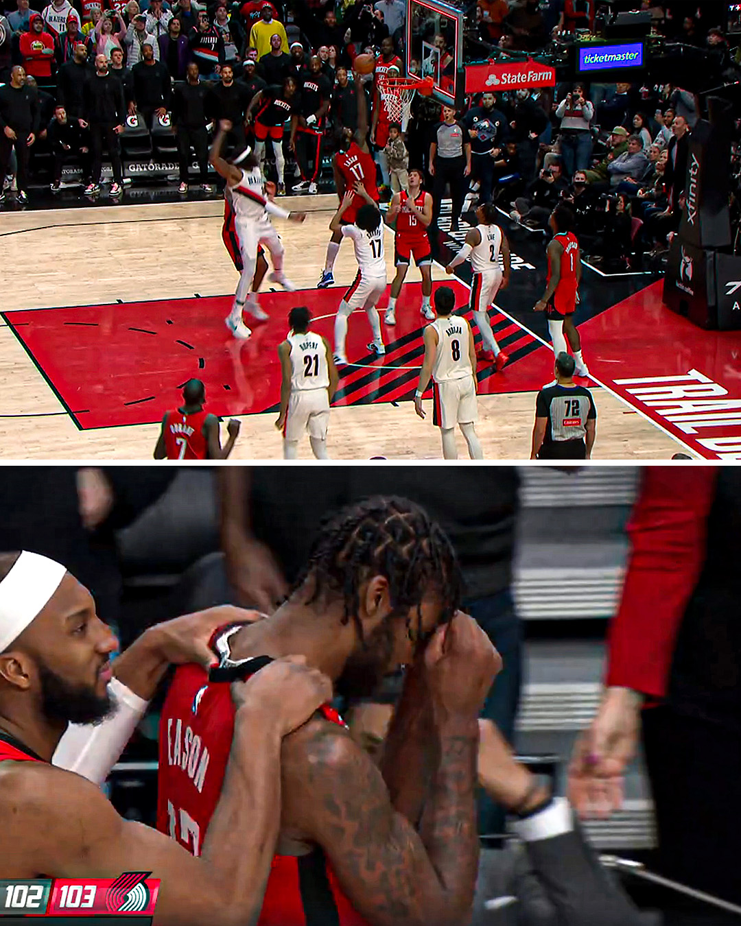 比賽末段哨音不斷。終場前 5.9 秒,拓荒者選擇戰術犯規將 Durant 送上罰球線,防止其投射三分。Durant 兩罰全中將比分追至一分差。隨後火箭 Eason 攔截發球成功,原本被吹判犯規,但火箭挑戰成功奪回球權,才有了最後 KD 的絕殺出手與Eason 超時補籃的戲碼。
