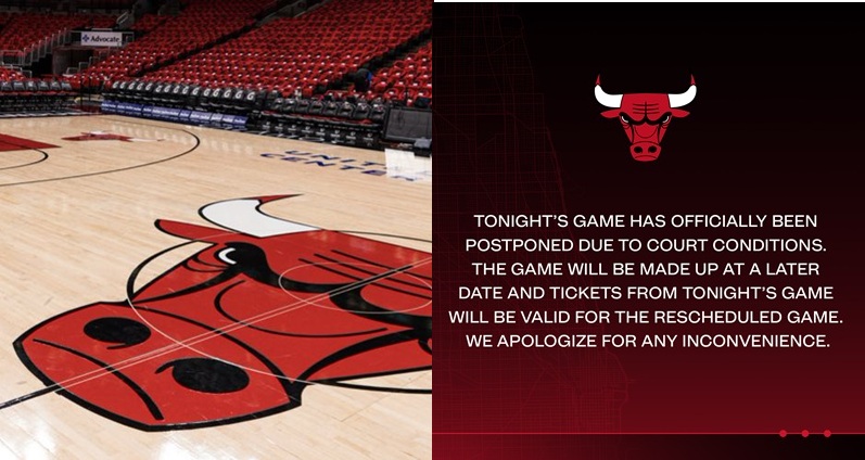 原定於週四(8日)晚間在芝加哥聯合中心(United Center)舉行的邁阿密熱火對戰芝加哥公牛之戰,因球場地面出現嚴重的冷凝水氣現象,導致比賽在延遲近兩小時後,最終由官方宣布被迫延期。
