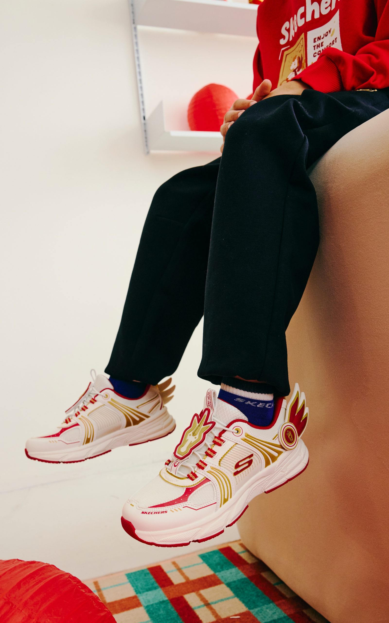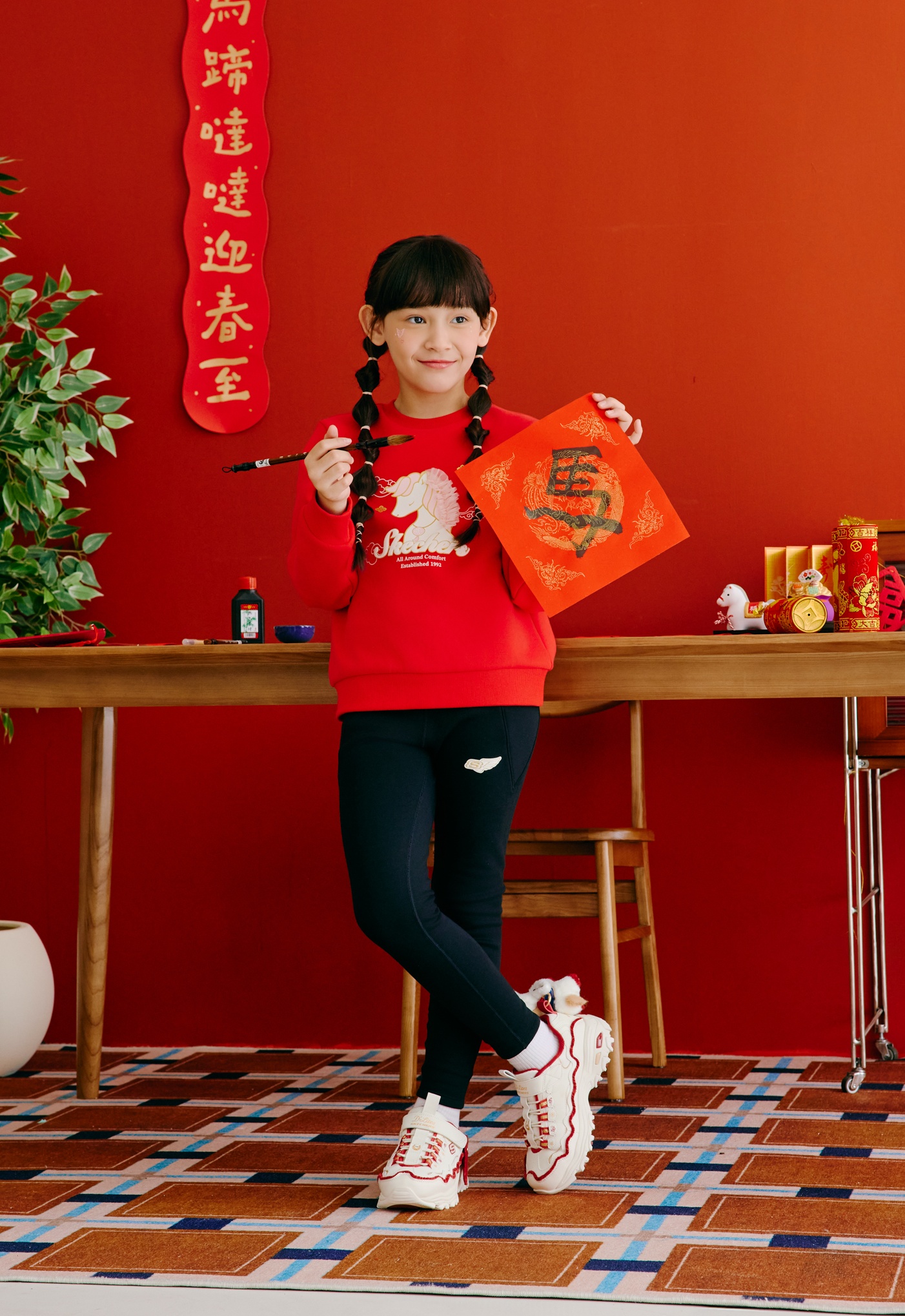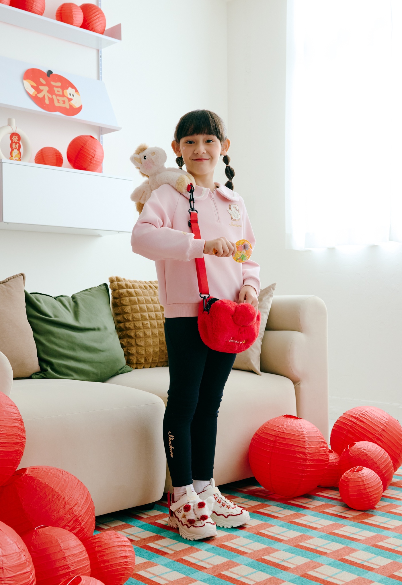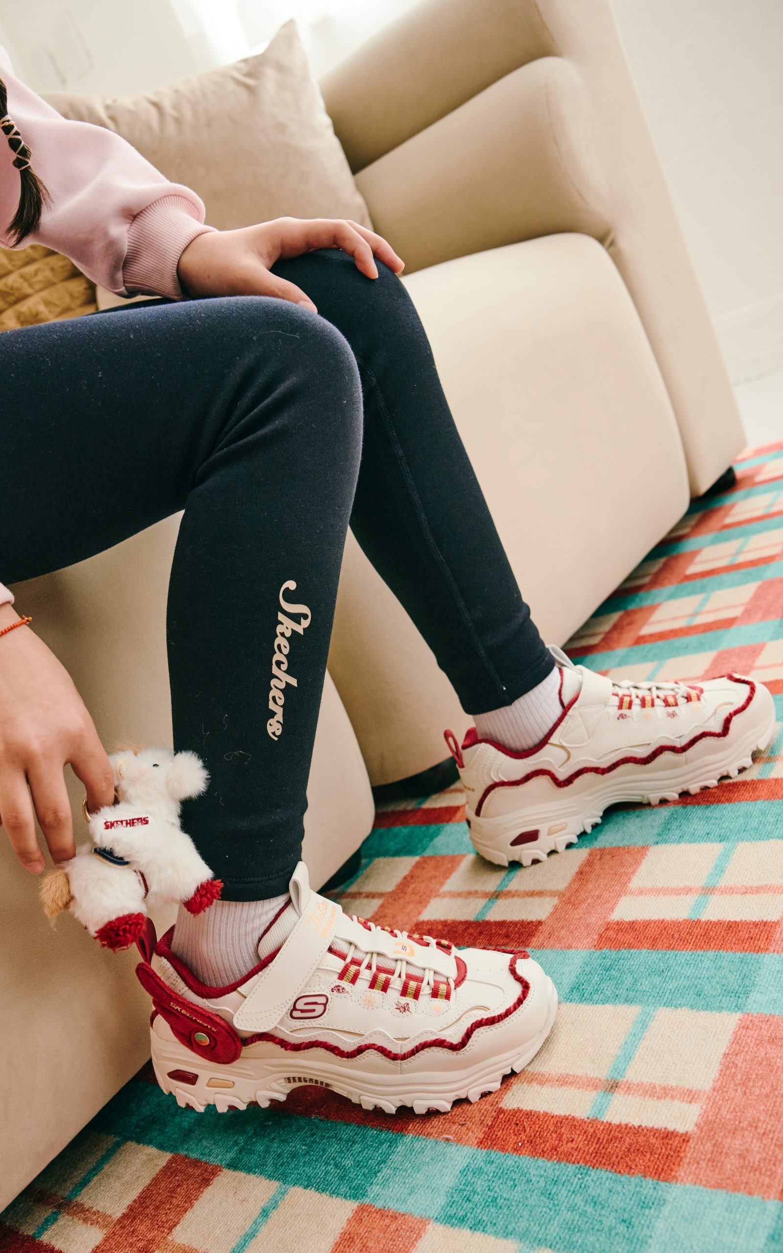 女童鞋款則推出 D’LITES 馬年系列新品,鞋舌以馬蹄鐵圖案裝飾,後腳跟同樣加入可拆卸飛馬翅膀點綴,延續展翅高飛的祝福寓意,鞋面以紅色毛絨滾邊包覆鞋面,並附贈超萌的獨家毛絨小飛馬吊飾,營造出滿分的新年儀式感。不只鞋款吸睛,新春馬年主題兒童系列服裝與配件同樣精彩,SKECHERS 推出附帶馬兒玩偶的毛絨斜背小包,夢幻設計連家長都忍不住想收藏!