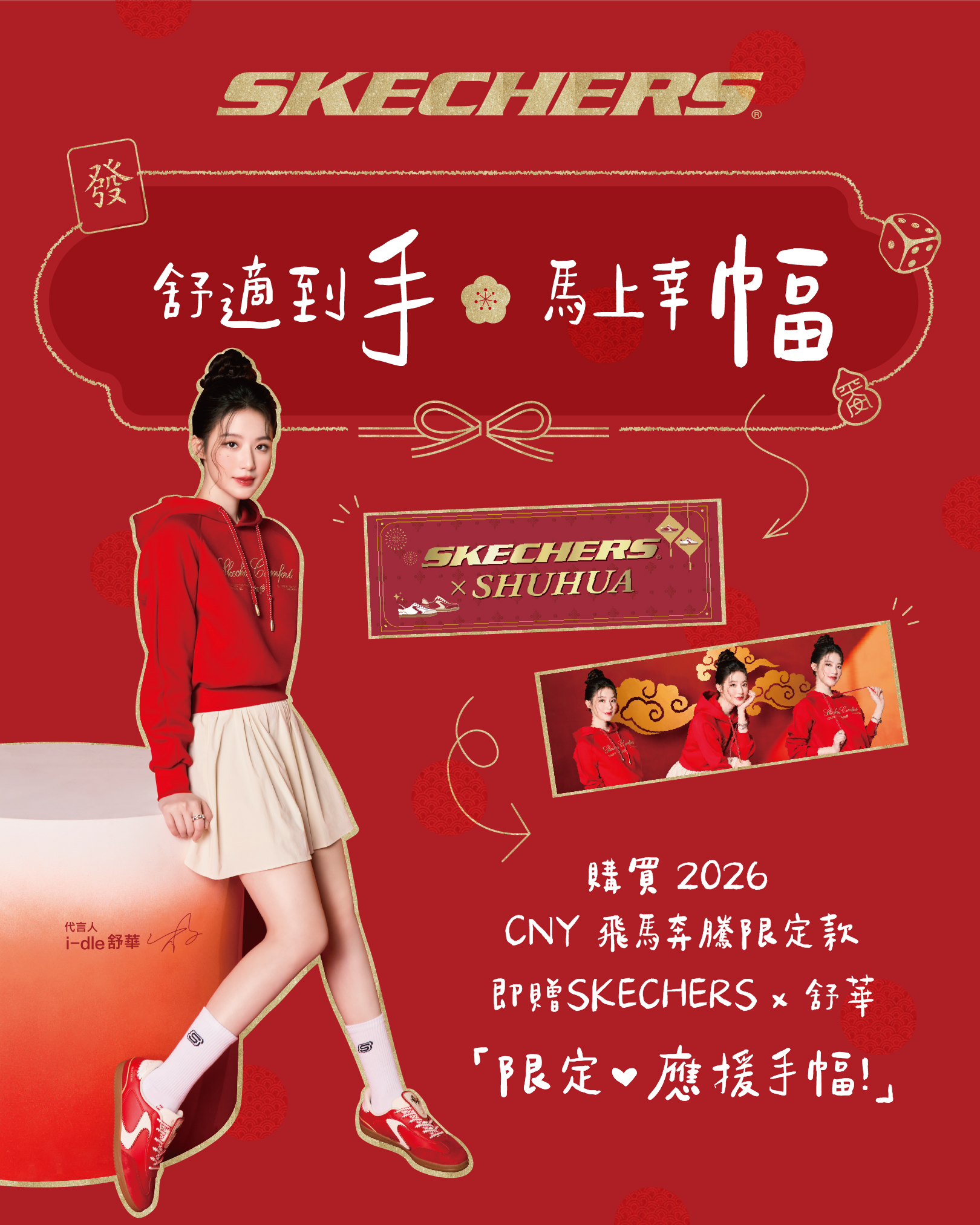 繼前兩波 SKECHERS x SHUHUA 手寫卡背小卡與語音小卡組 引爆全台搶購熱潮後,SKECHERS 在 2026 農曆新春再度出招,重磅推出【SKECHERS x 舒華限量應援手幅】!將新年節慶圖騰與舒華身穿潮流帽 Tee 的俏皮形象完美融合,洋溢著活力滿點的喜氣氛圍,不僅展現 SKECHERS 核心的舒適時尚精神,更是極具收藏價值的開運神物。自 1 月 20 日起,只要在 SKECHERS 全通路入手「飛馬奔騰」新年主題系列商品,就能將這份充滿舒華應援能量的限量珍品帶回家。無論是現場應援還是日常收藏,這波年度限定驚喜絕對是粉絲的必收名單。新春開運與舒適升級一次到位,數量有限,務必看準時間手刀開搶!