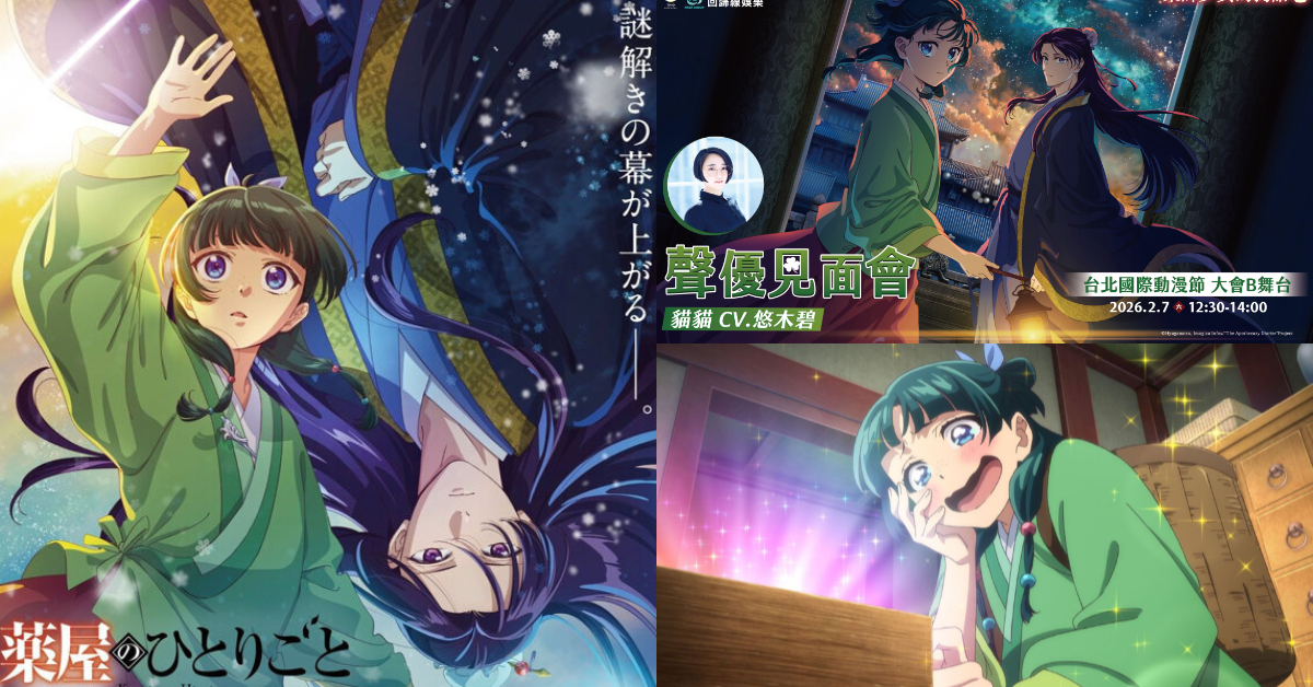 動漫迷們注意啦!《藥師少女的獨語》主角「貓貓」的聲優悠木碧,將於2026年2月7日來台,參加在台北國際動漫節舉辦的特別見面會,讓粉絲們有機會近距離聆聽她重現經典配音片段,並分享自身配音心得。這次活動由東寶與回歸線娛樂攜手舉辦,預計成為本屆動漫節最受矚目的亮點之一。