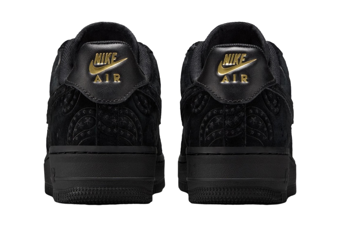 這次推出儘管是不同鞋型,但經典程度相當。可以看見此款 Air Force 1 Low 以黑色調示人,全鞋覆蓋地麂皮材質走出了低調奢華的路線,相同色調的變形蟲紋路,因由光影變化亦能使其體現出絕美的紋理層次,完全相輔相成。而為了加倍突顯出質感,後跟包片、鞋舌更以皮革包裹,並且在各個醒目地細節處配上金色,完美地融合高端與街頭的氛圍,絲毫不遜於聯名款式,造型上的運用亦更加靈活出色。