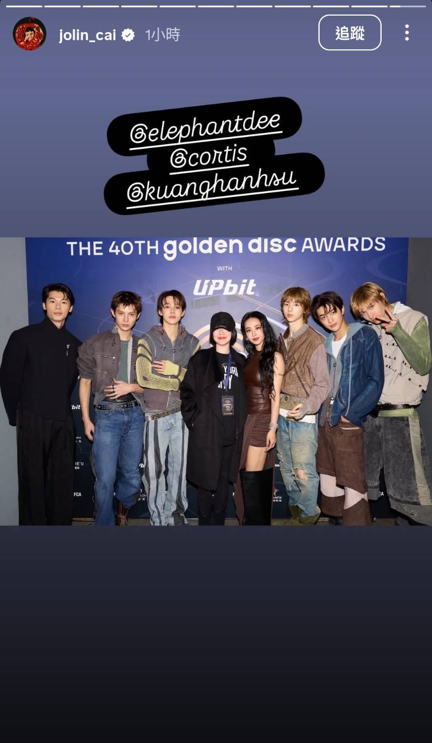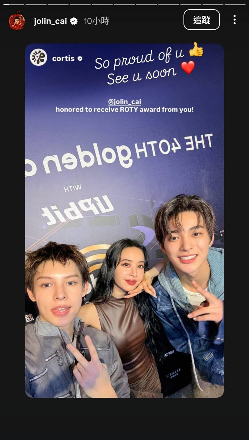 南韓新生代男團 CORTIS 1/10 出席在台北大巨蛋盛大舉辦的金唱片頒獎典禮,天后蔡依林( Jolin )受邀擔任頒獎人,她先以韓文向觀眾們打招呼,再用英語揭曉新人獎,CORTIS 團員中除了金主訓之外,其他人都慢半拍當機,其中台籍成員趙雨凡獲知得獎時還忍不住笑出來,事後趙雨凡、安乾鎬與蔡依林合照,拍攝〈What You Want〉趣味影片,吸引超過 77 萬人觀看。