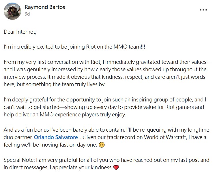 直到最近,Riot Games 宣布,曾擔任《魔獸世界》首席製作人的 Raymond Bartos 正式加入《英雄聯盟》MMO 團隊,並將肩負起該作製作人的重任。