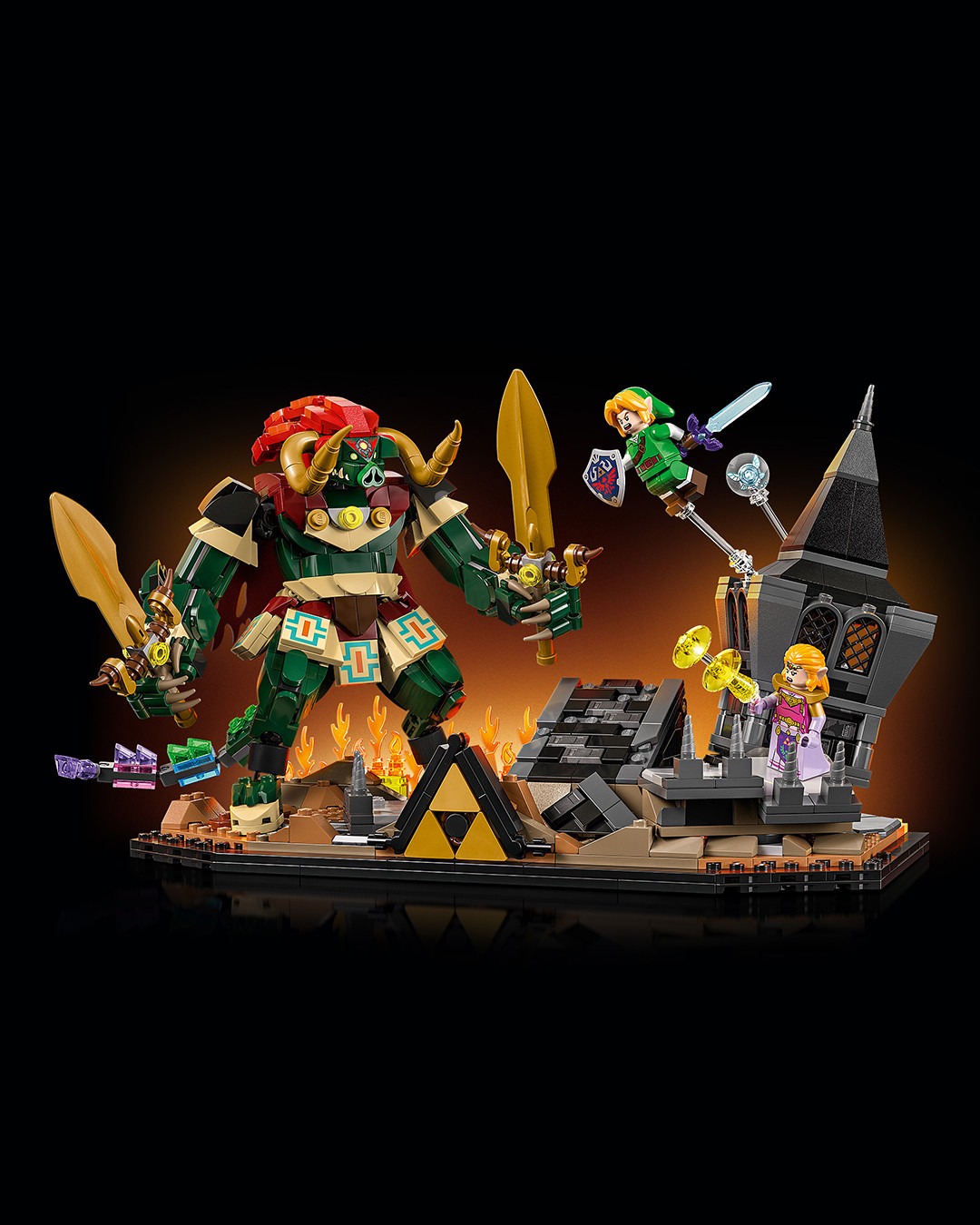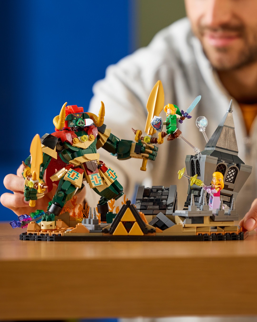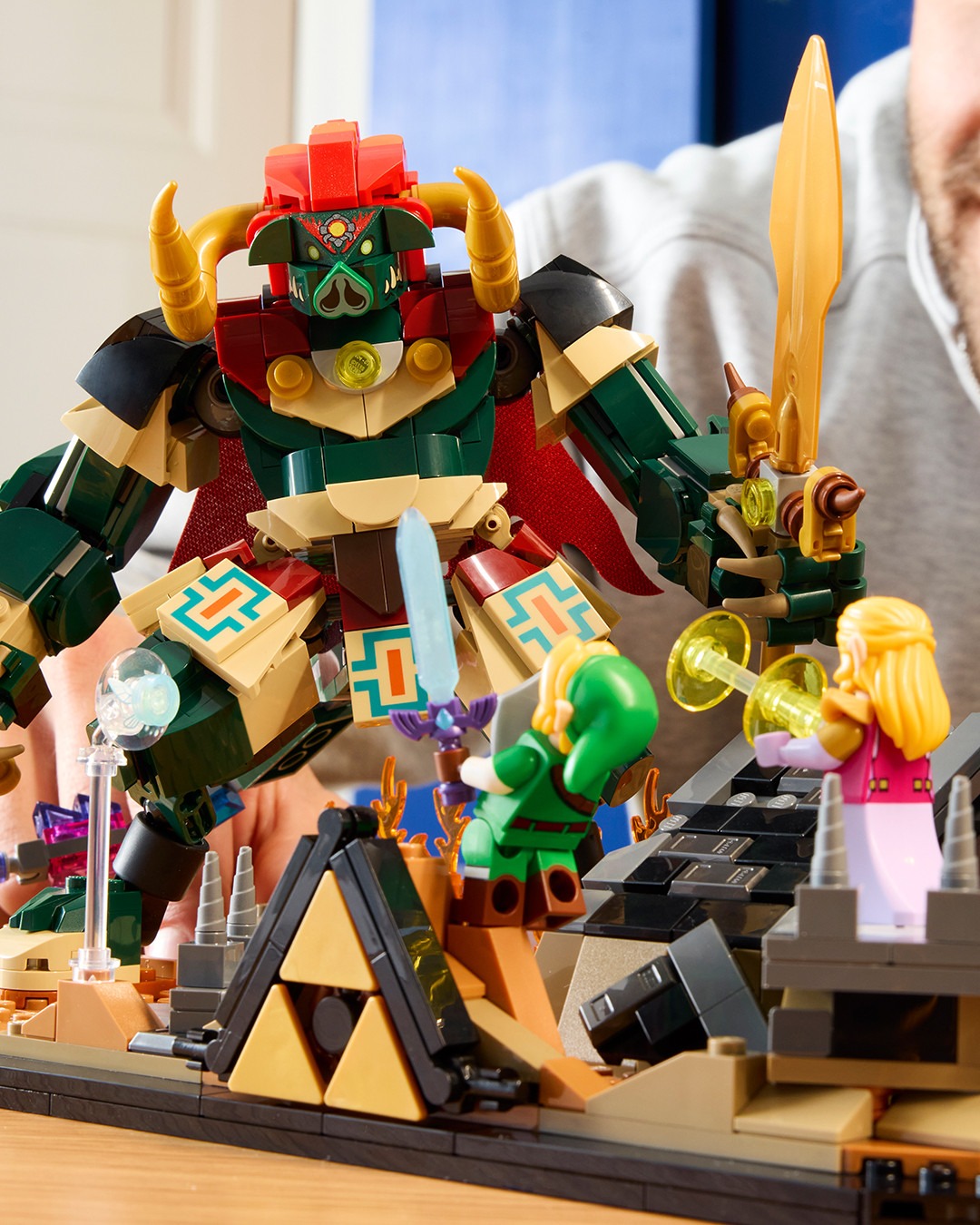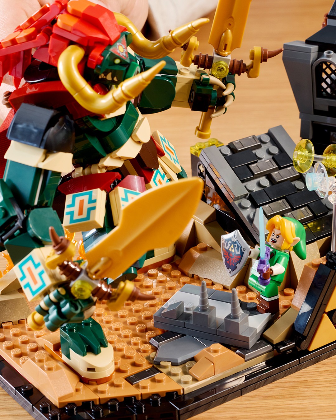 本次 LEGO 直接汲取《薩爾達傳說 時之笛》討論度最高的 BOSS 對戰,整個主題套裝完美還原遊戲中的經典結局。可以看見設計方面聚焦在薩爾達公主與反派角色加農多夫,在隨時會崩落的城堡內激烈對決,全數零件組合共有 1,003 組件,並且附帶重要的恢復之心、大師之劍、海利亞盾、百萬噸鐵鎚,以及懸浮在附近的藍色小精靈娜薇等配件。值得一提的是,該系列還巧妙地配備按鈕,只要收藏家們按下便可以讓加農多夫從廢墟中現身,沉浸式體驗十足。