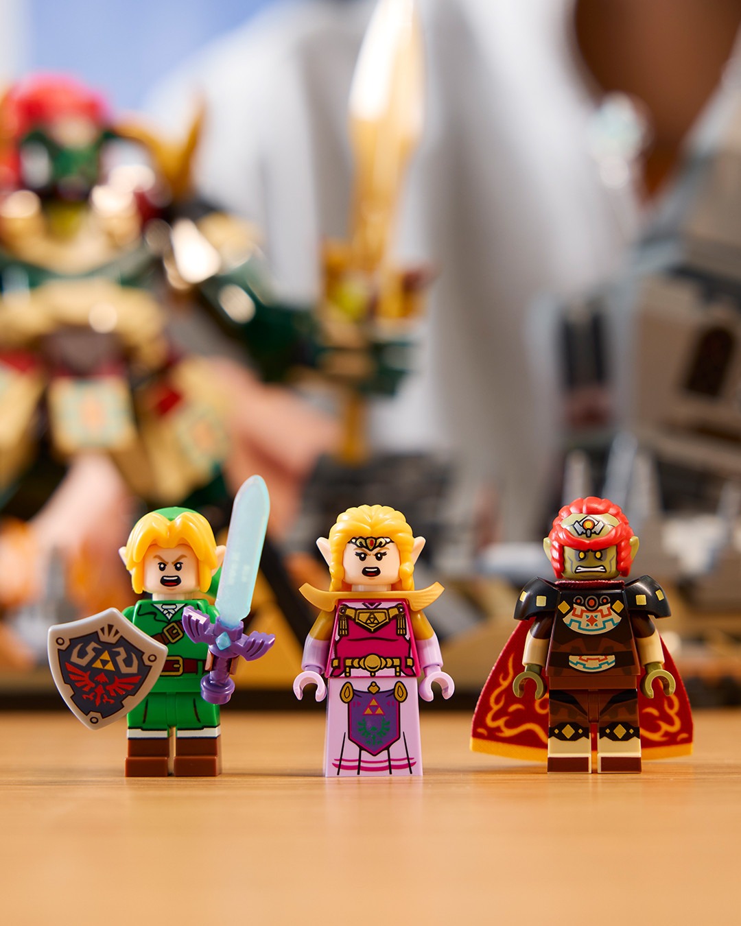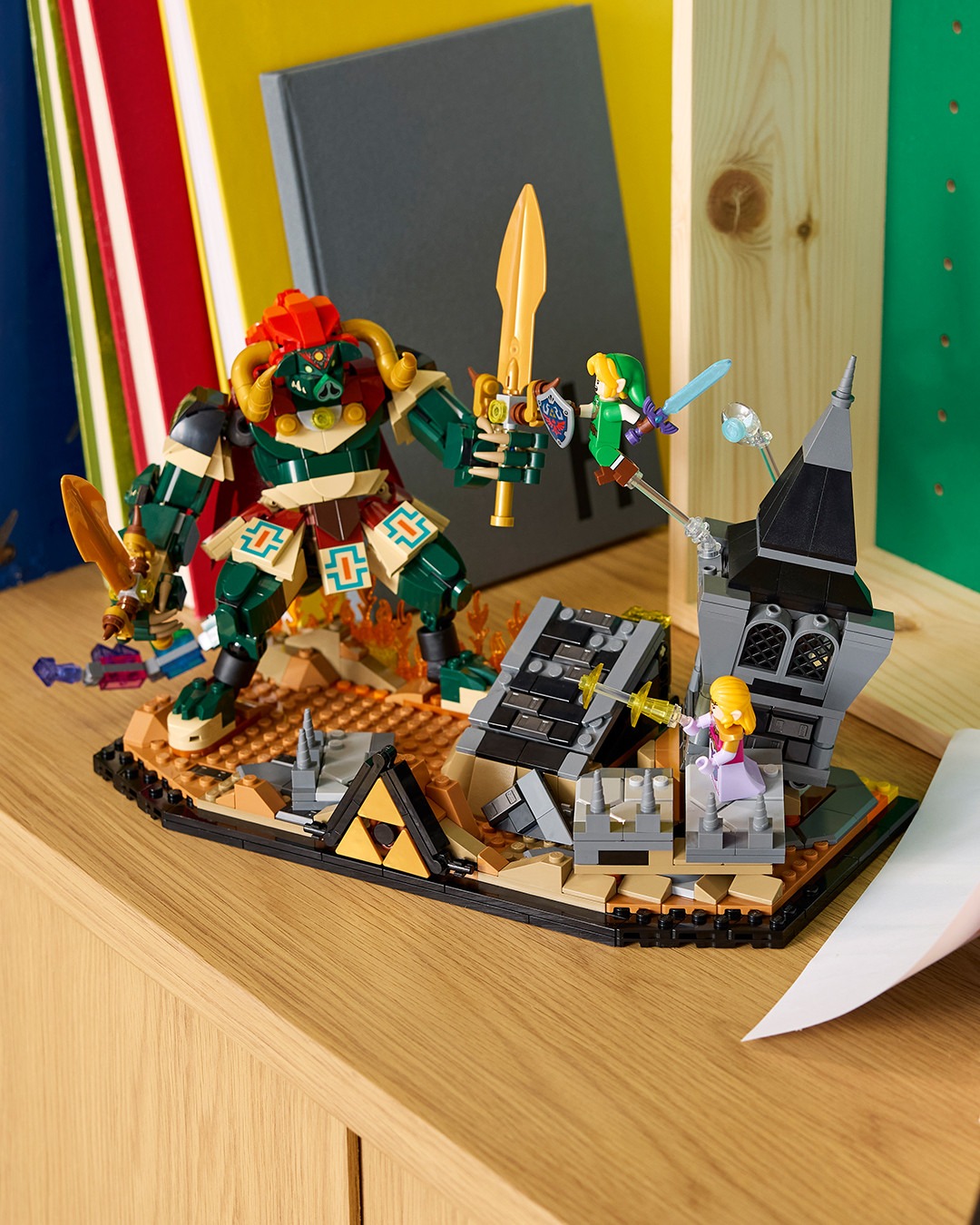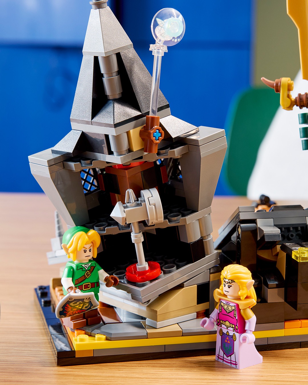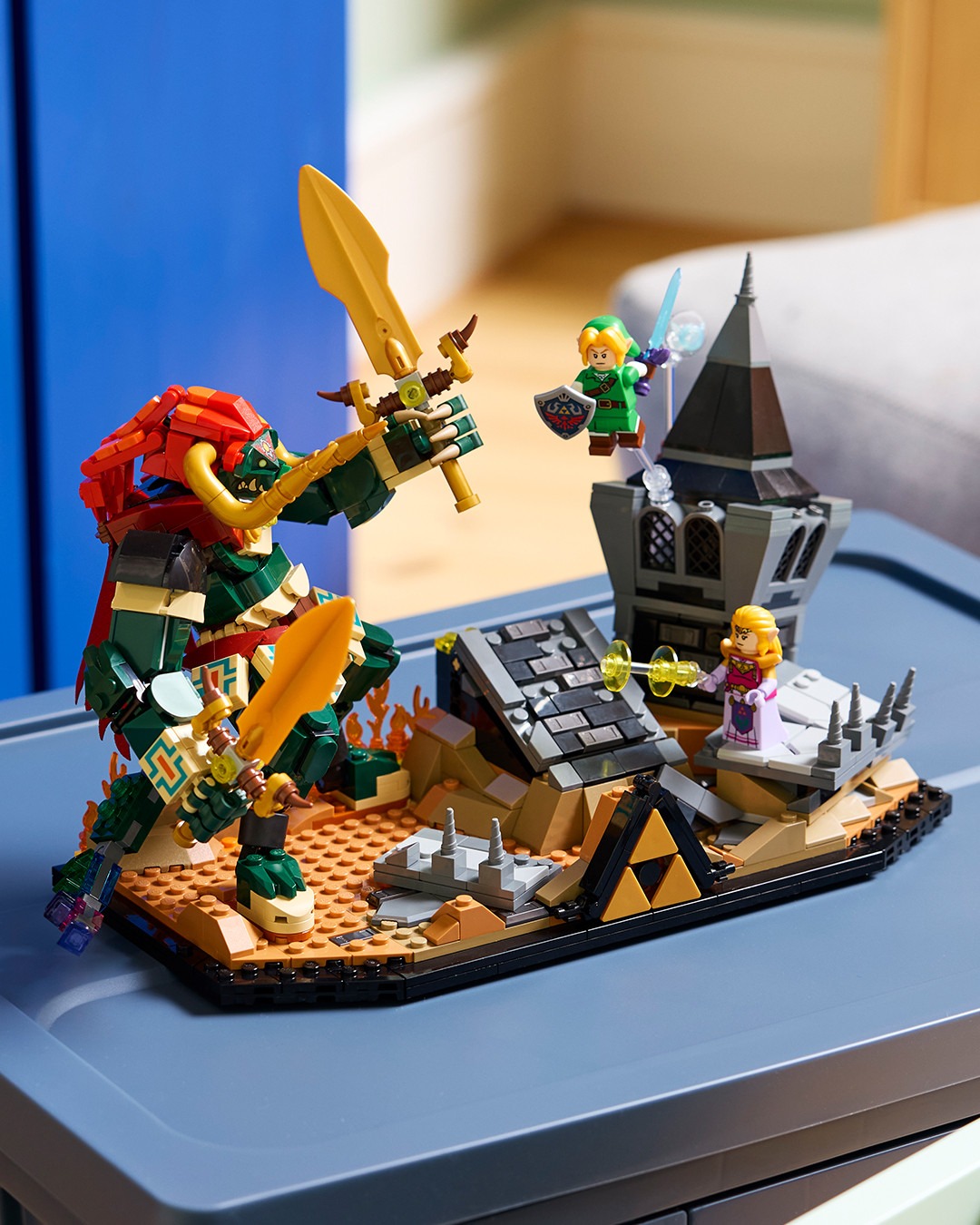 本次 LEGO 直接汲取《薩爾達傳說 時之笛》討論度最高的 BOSS 對戰,整個主題套裝完美還原遊戲中的經典結局。可以看見設計方面聚焦在薩爾達公主與反派角色加農多夫,在隨時會崩落的城堡內激烈對決,全數零件組合共有 1,003 組件,並且附帶重要的恢復之心、大師之劍、海利亞盾、百萬噸鐵鎚,以及懸浮在附近的藍色小精靈娜薇等配件。值得一提的是,該系列還巧妙地配備按鈕,只要收藏家們按下便可以讓加農多夫從廢墟中現身,沉浸式體驗十足。