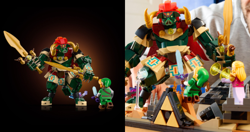 本次 LEGO 直接汲取《薩爾達傳說 時之笛》討論度最高的 BOSS 對戰,整個主題套裝完美還原遊戲中的經典結局。可以看見設計方面聚焦在薩爾達公主與反派角色加農多夫,在隨時會崩落的城堡內激烈對決,全數零件組合共有 1,003 組件,並且附帶重要的恢復之心、大師之劍、海利亞盾、百萬噸鐵鎚,以及懸浮在附近的藍色小精靈娜薇等配件。值得一提的是,該系列還巧妙地配備按鈕,只要收藏家們按下便可以讓加農多夫從廢墟中現身,沉浸式體驗十足。