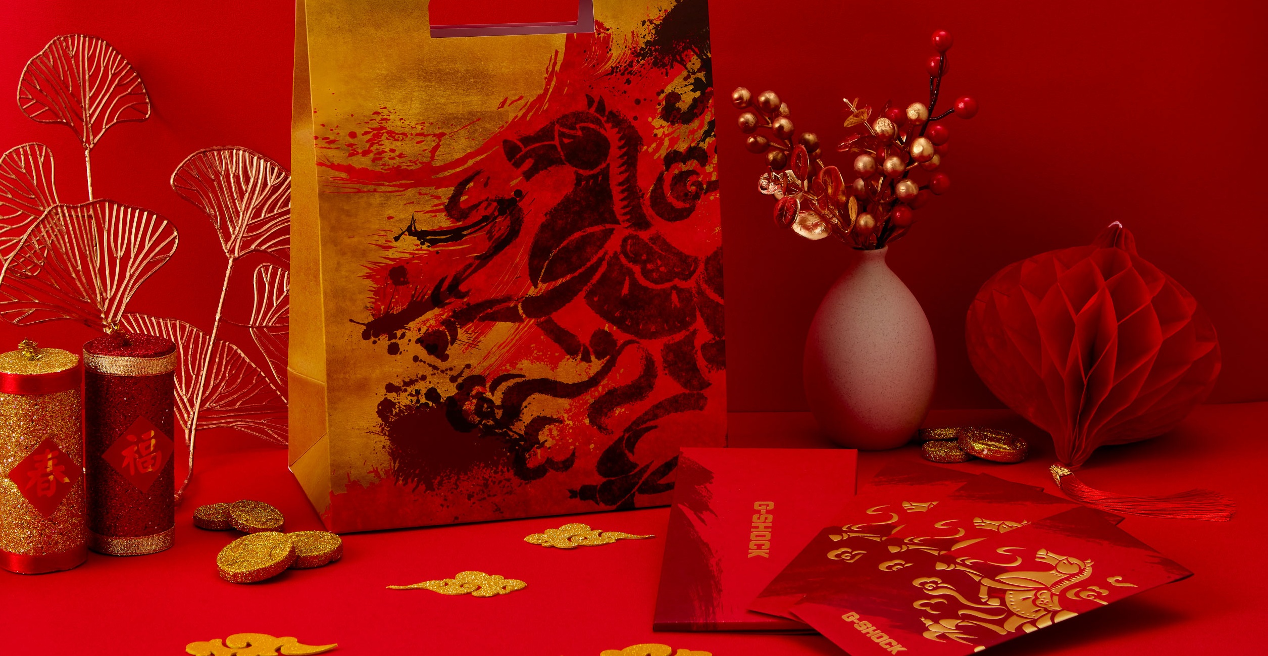 活動期間於CASIO直營門市(包含Outlet)購買福袋更加碼贈送G-SHOCK馬年紅包袋!