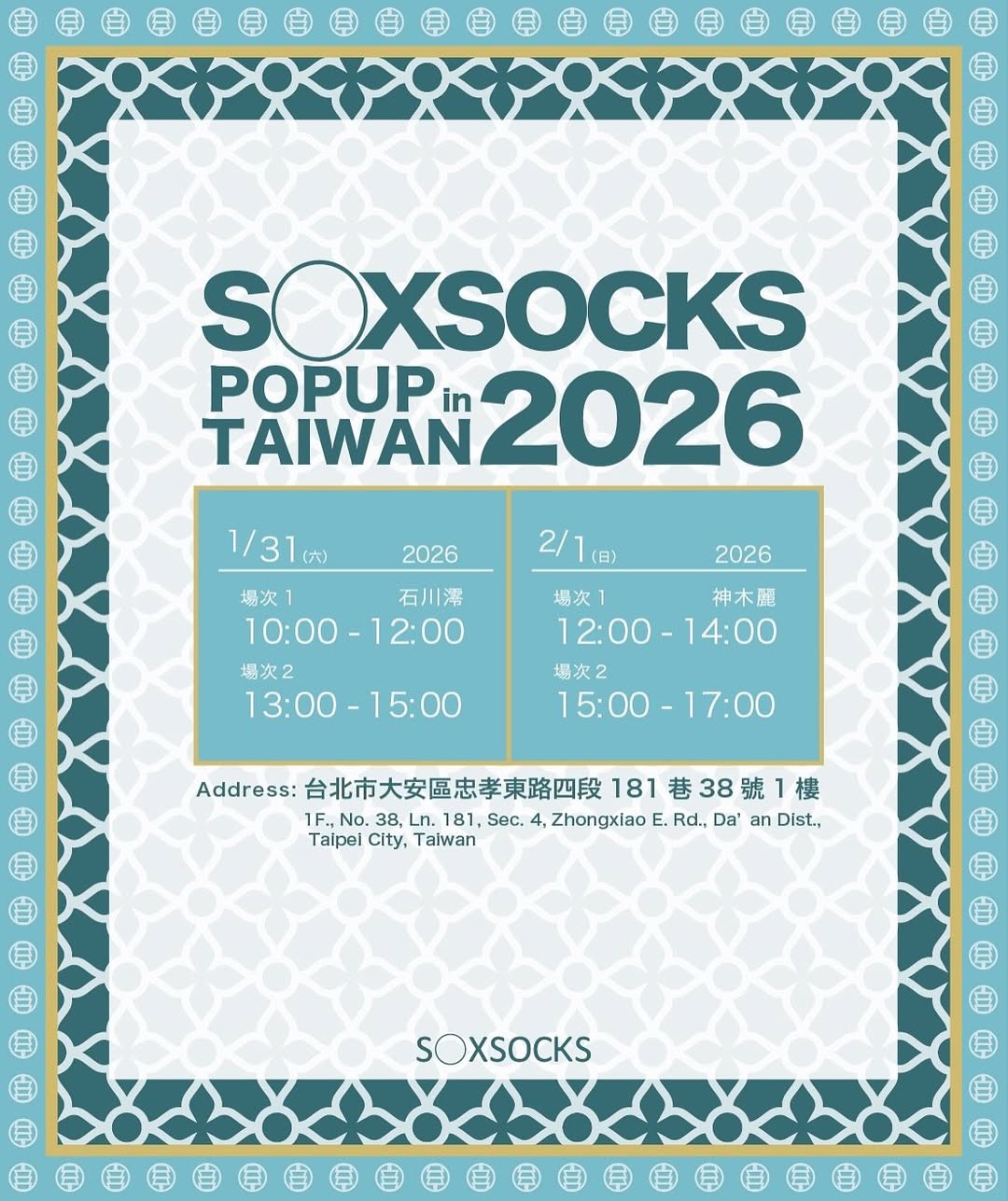且除了上述人物們,積極朝往服飾領域發展的動作,近年多位頂流要角們亦經常與潮流單位 S◯XSOCKS 合作,並掀起廣泛的討論熱潮。這個發跡自東京的街頭品牌,S◯XSOCKS 過往除了曾與 FR2 聯名推行商品, 近年更多次攜手頂流要角們呈現聯乘服飾,精彩演繹出獨到的次文化韻味。然而,隨著嶄新 2026 年的到來,S◯XSOCKS 亦正式官宣將於 1/31、2/1 在台北東區舉行 pop-up store,且預備於現場發行 “台灣限定配色” 的服飾外,更會力邀到兩大頂流人物:石川澪、神木麗 現身店舖,進而呈現備受話題特典活動。