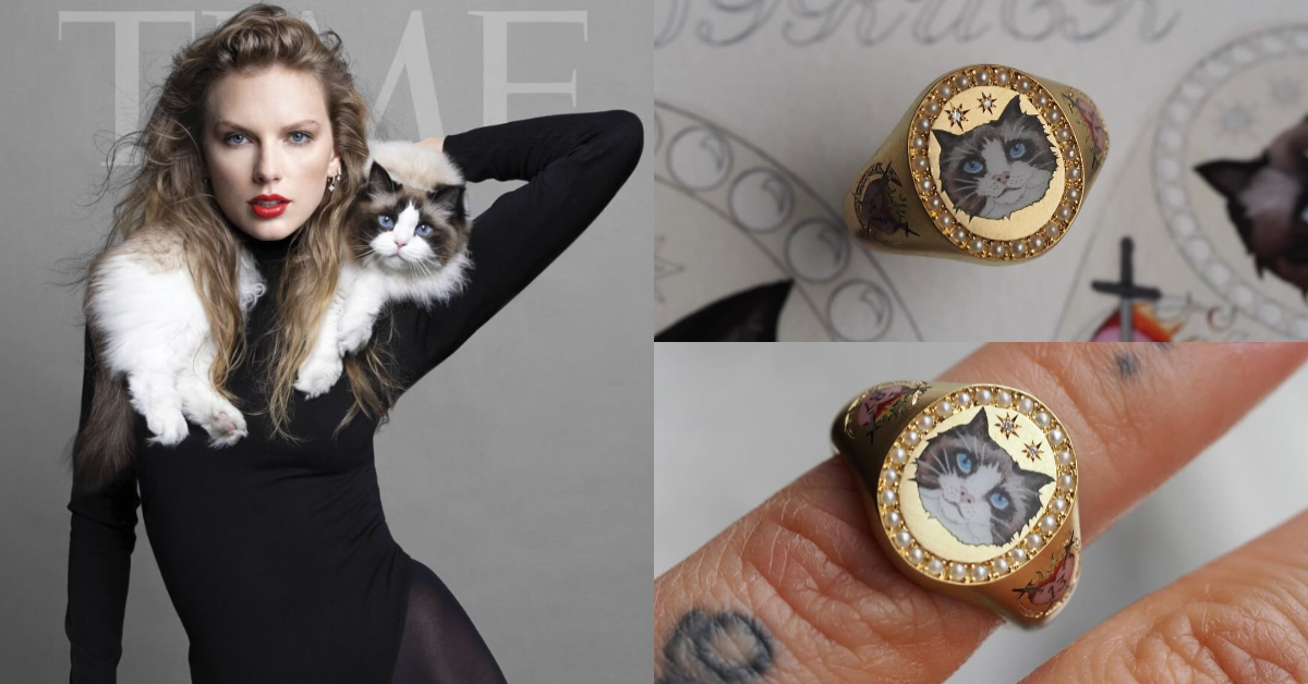 幸運貓咪「班傑明」是泰勒絲在 2019 年拍攝《ME!》MV 時所收養,近日泰勒絲好友特別邀請知名珠寶設計師 Cece Fein-Hughes 替天后打造專屬戒指,戒指上的「班傑明」頭像周圍環繞著溫潤珍珠,戒環則點綴著燃燒愛心,設計理念是「希望泰勒絲將最珍愛的事物永遠銘記於心」,該枚貓咪戒指曝光後吸引超過 3 萬名網友們按讚。