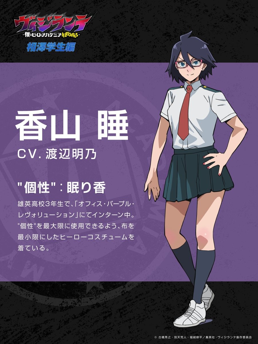 除了公開「相澤學生篇」的全新視覺情報圖和預告之外,《正義使者 – 我的英雄學院之非法英雄》官方也揭露了接下來將擔任主線劇情角色的全新視覺圖和聲優資訊,相澤消太由諏訪部順一擔綱配音、白雲朧的聲優為小野賢章、山田陽射由吉野裕行擔綱配音、香山睡的聲優為渡邊明乃擔任,以及這個篇章將登場的新角色紫殿下,將由小山乃也負責配音,且有趣的地方是這位角色的個性竟是「胸毛」,讓人很好奇他會有什麼發揮!