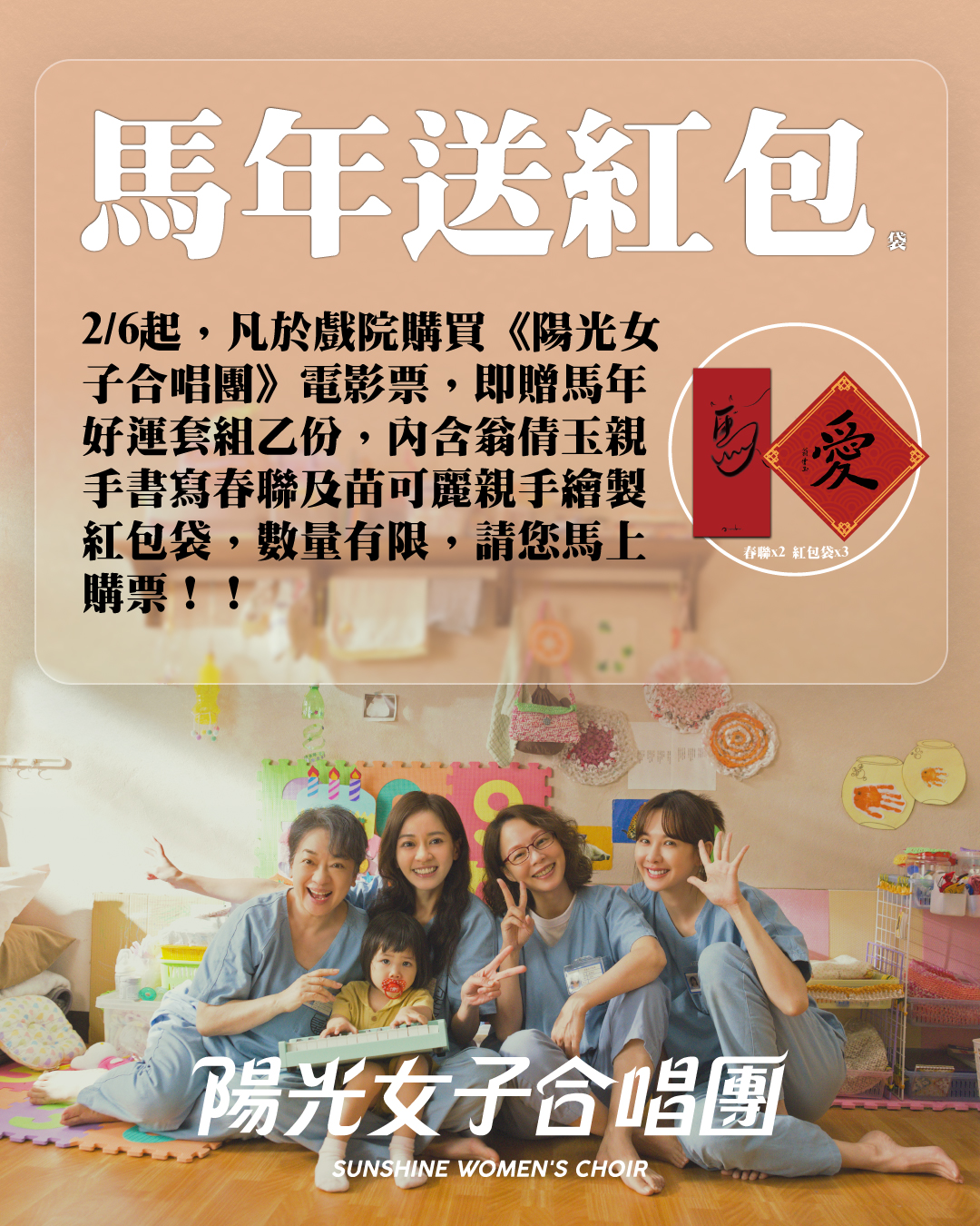 不只片尾藏驚喜,《陽光女子合唱團》也同步推出充滿年節氣氛的「馬年好運套組」。凡於 2 月 6 日(五)起購買《陽光女子合唱團》電影票乙張,即可憑票至原購票影城臨櫃兌換套組乙組,數量有限,送完為止。
