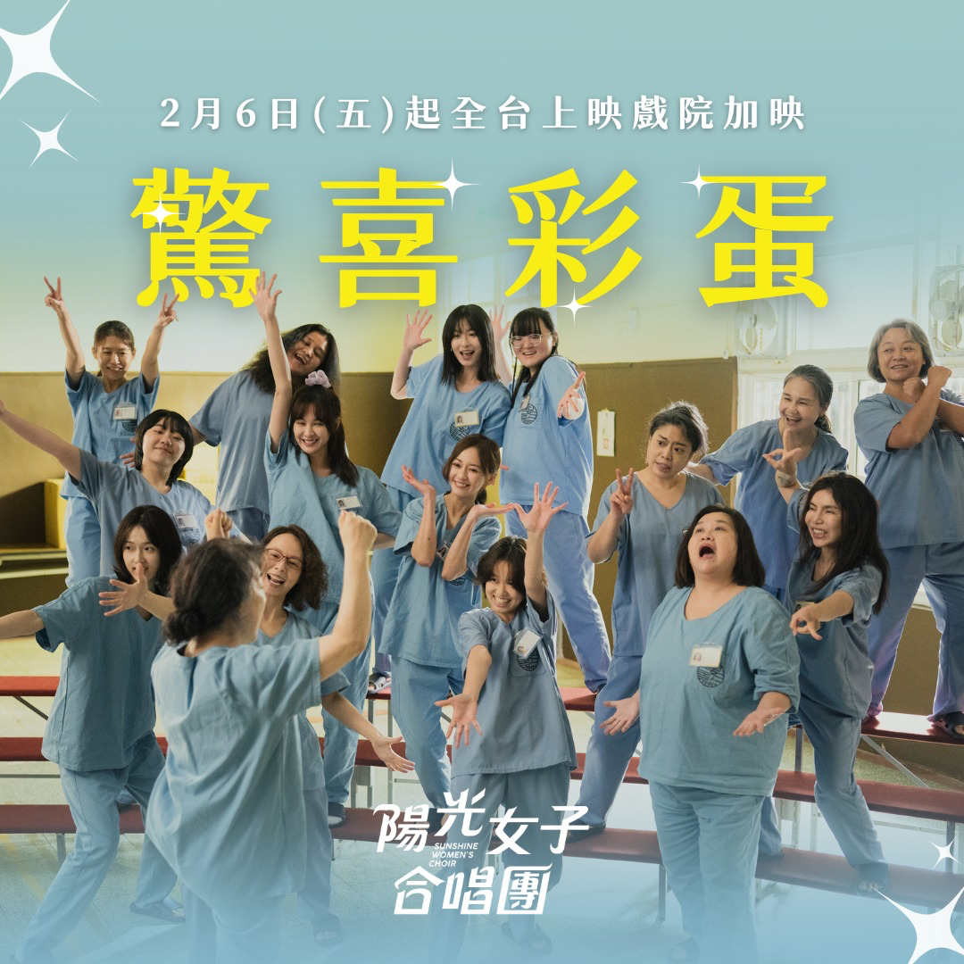《陽光女子合唱團》官方社群在稍早宣布,自 2 月 6 日(五)起,《陽光女子合唱團》將於全台上映戲院加映「驚喜彩蛋」,提醒觀眾片尾字幕結束後千萬別急著離場,錯過就真的只能等下次。