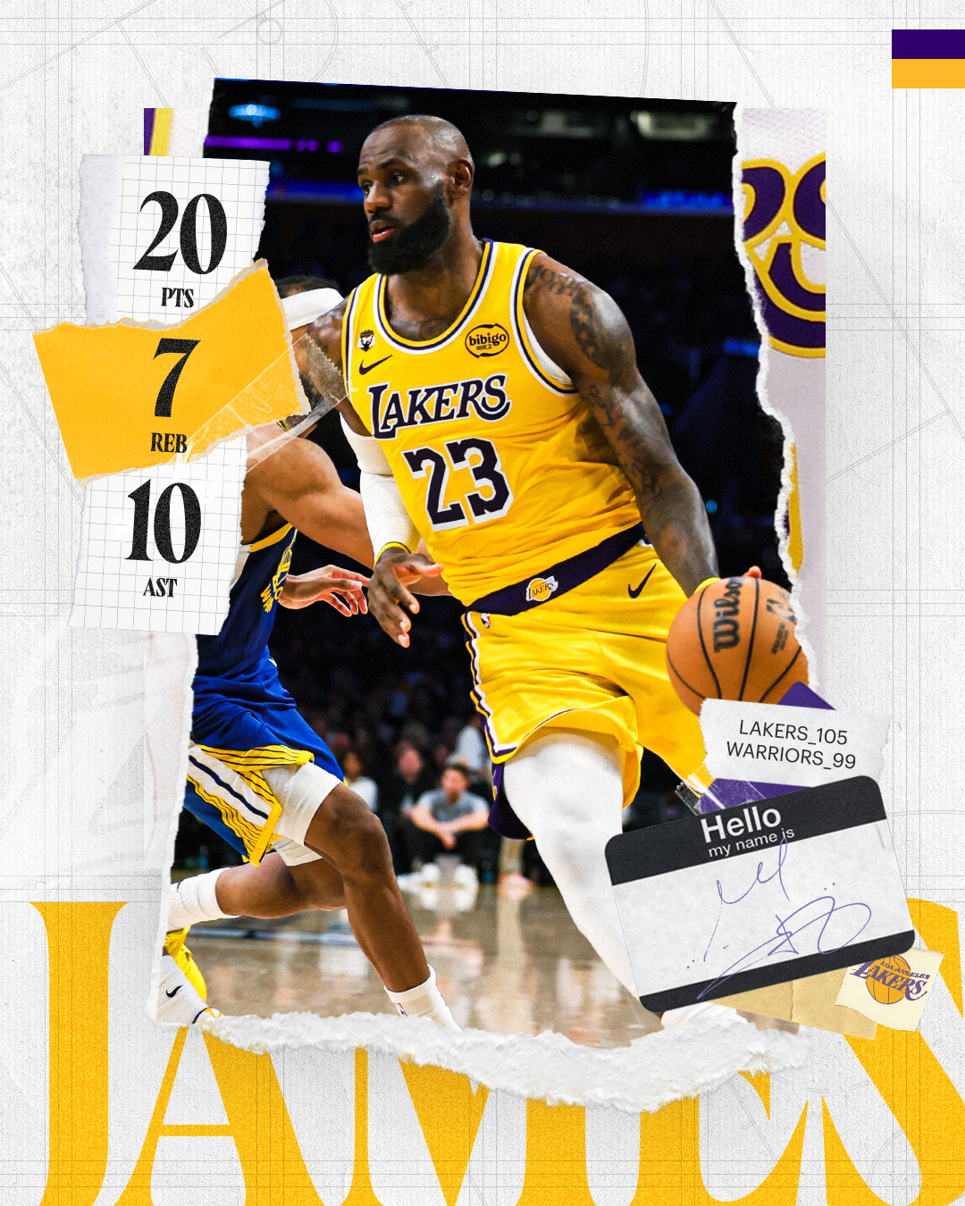 易籃後,LeBron James 展現統治力,開局便連拿 6 分助隊反超,隨後更完成多次三分打,帶領湖人打出一波流將領先擴大至11分。勇士並未輕易認輸,穆迪全場攻下 20 分為勇士續命,加上 Gui Santos 在第四節末段命中三分,一度將分差縮小至僅剩1分。