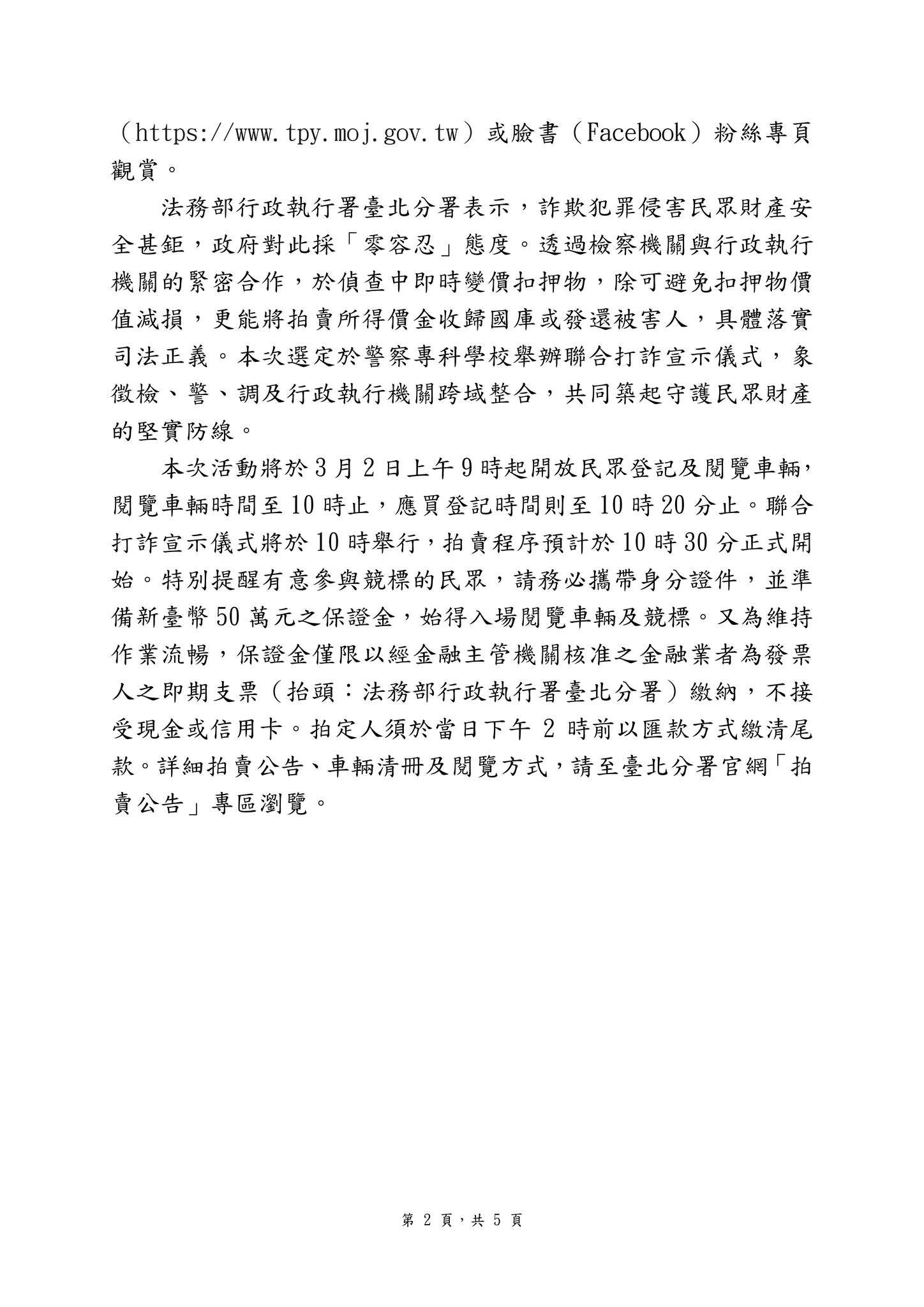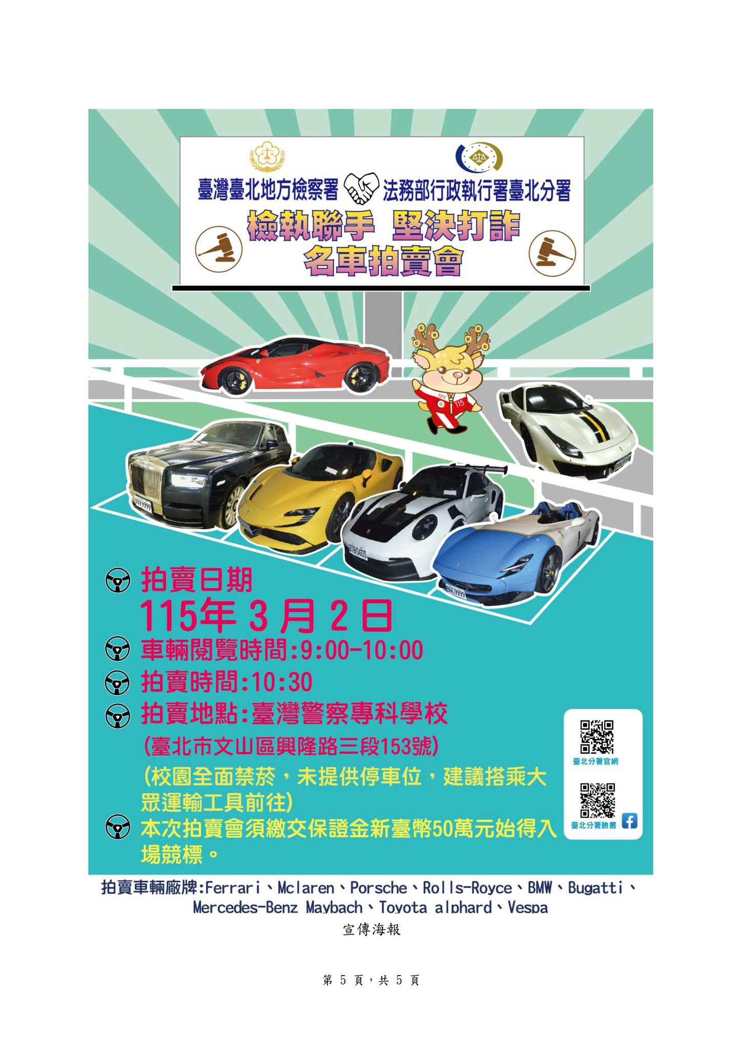 法務部行政執行署臺北分署將於3月2日在臺灣警察專科學校舉辦史上最豪華的「聯合打詐名車拍賣會」。本次拍賣焦點為涉嫌詐欺案被扣押的太子集團名車,其中更有數款全球限量級別超跑,欲購車者必須準備50萬的保證金才有辦法參加拍賣。