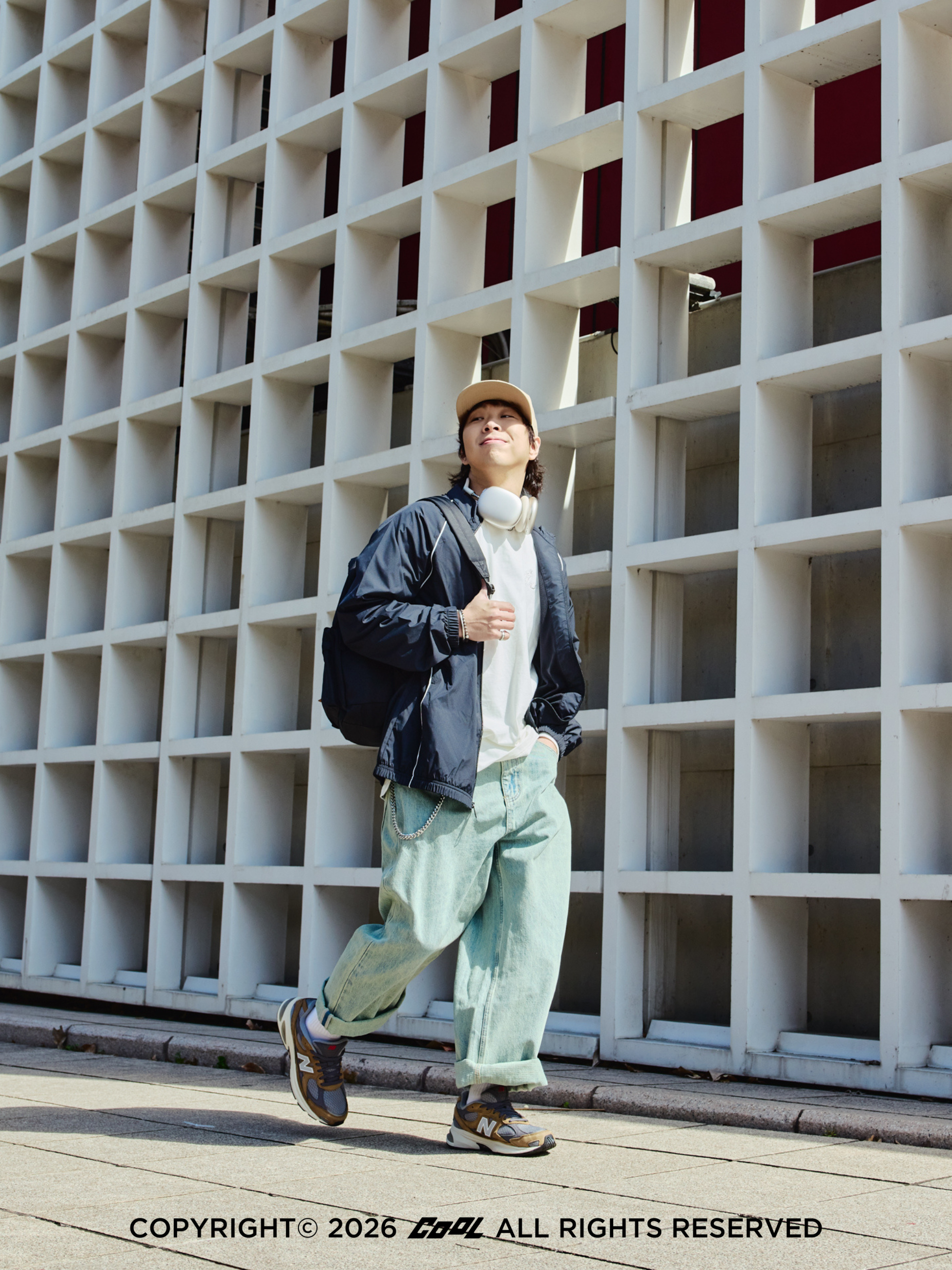 當來到假日的看球應援,Kevin 在風格呈現上精準拿捏了 City Boy 那份率性且不費力的平衡感。以 NB聯名系列黑色運動外套為核心,內搭純白 T-shirt 與寬鬆牛仔褲,並揹上聯名背包、戴上經典標誌的棒球帽,透過 NB 擅長的低調質感與異材質堆疊,在不經意間勾勒出細膩的街頭輪廓,更是 NB 陪伴球迷投入球場的標記,在全壘打瞬間或是跟著賽事節奏吶喊,都讓他在看台上能毫無束縛地全然投入球場熱氣。