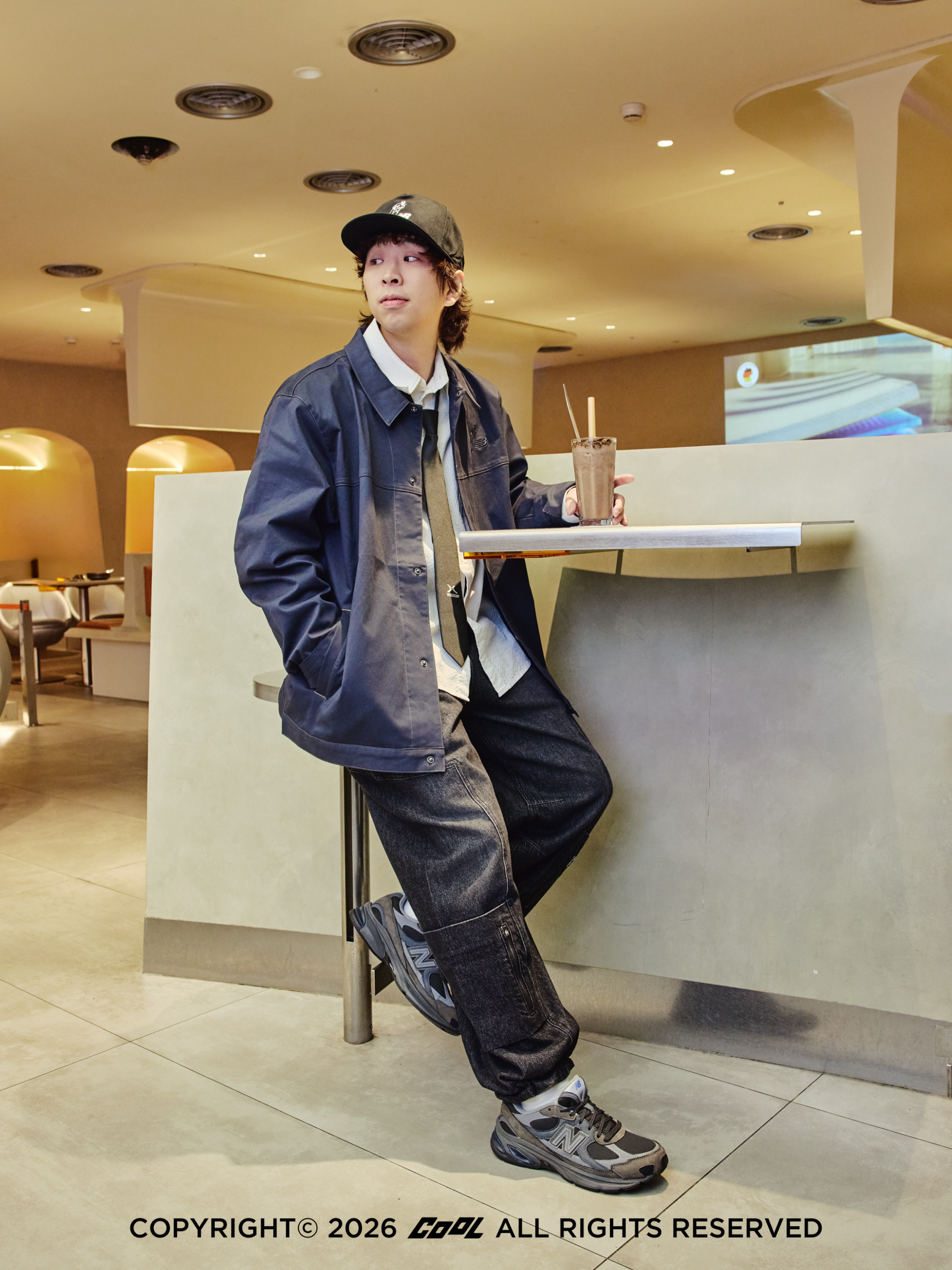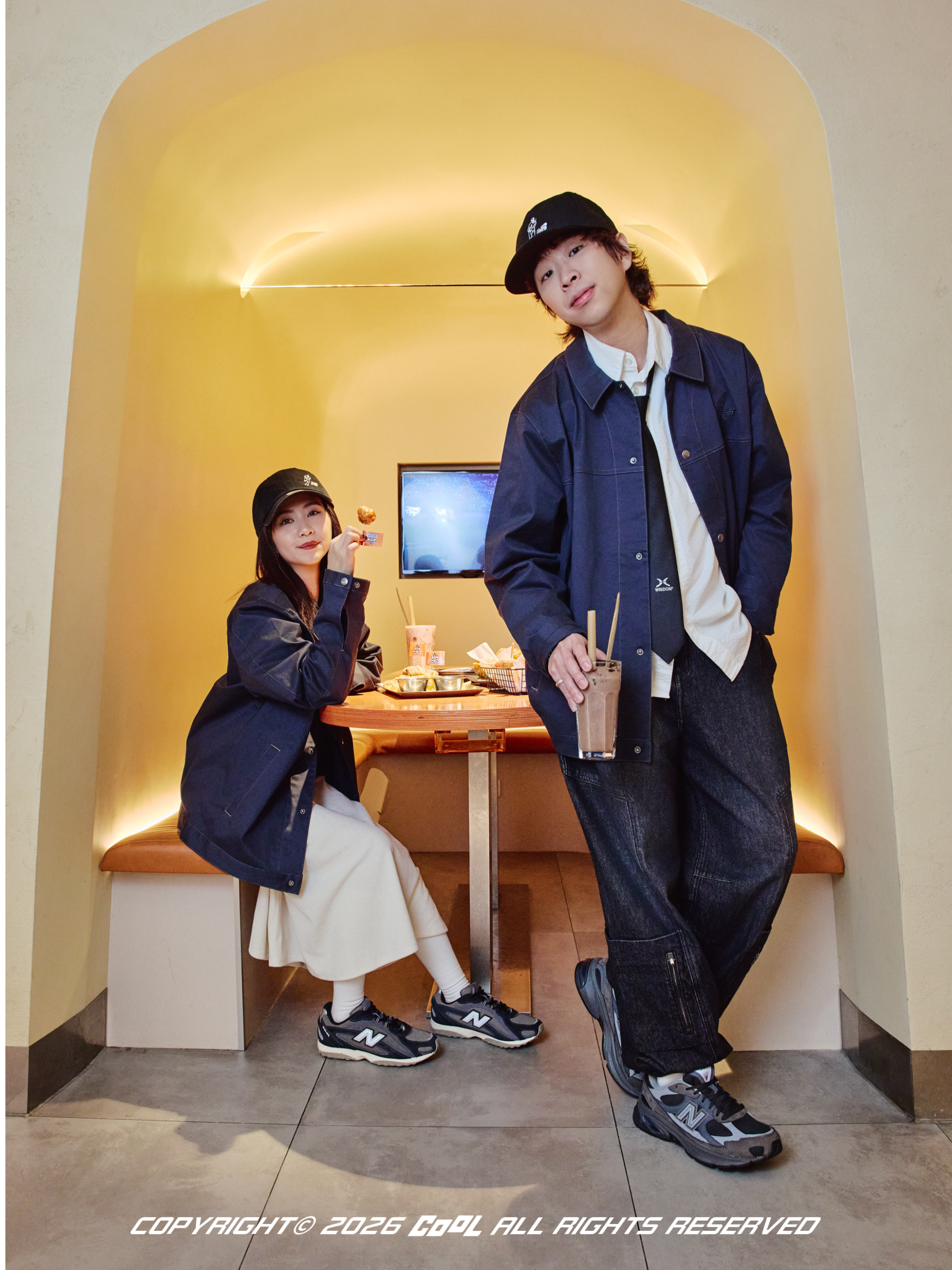 當燈光轉暗,切換至充滿氛圍感的運動餐廳,這份「二刀流」也隨之轉化成更有層次的浪漫。Kevin 巧妙地在經典教練外套內繫上領帶,這正是 NB 跨越領域的魅力所在——讓「大人感」的運動混搭在餐廳螢光下,散發出低調內斂的紳士深度,展現出 NB 經典不敗的風格韌性。