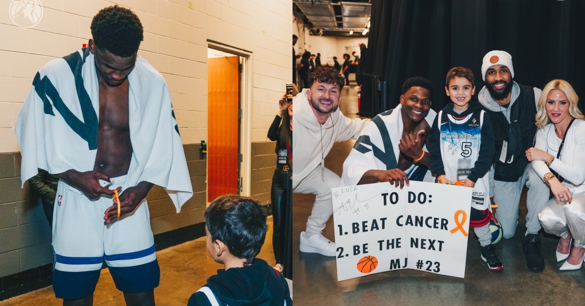 Anthony Edwards 與 Luca 的第一次相遇發生在 2025 年 1 月。當時年僅六歲、罹患白血病的 Luca 穿著 AE 球衣來到灰狼主場觀賽,手中舉著寫著「我還要做:1.戰勝癌症 2.變成下一位 Jordan」的牌子。Edwards 在返回休息室途中注意到這位小球迷,立刻停下腳步與他合照並簽名。原本只是球星與球迷之間短暫而溫暖的互動,卻在 Luca 將自己手上的橘色手環送給 AE 的那一刻,出現了轉折。深受感動的 Edwards 當場許下承諾:「我會把這條手環戴在左手上,直到我職業生涯結束,就為了你。」也讓兩人在那天訂下了一段真正的約定。