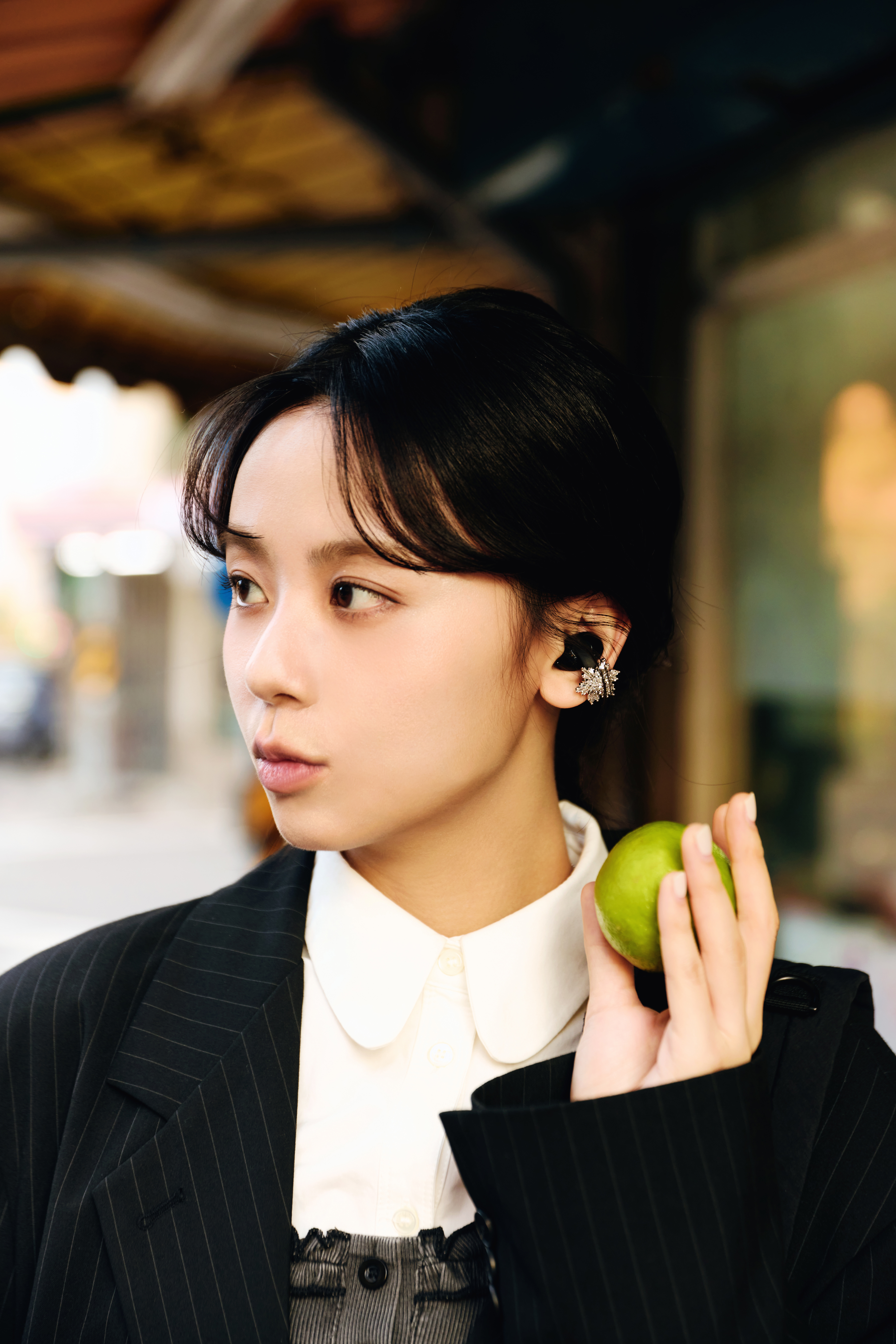 如果說 Liberty Buds 是為了沈浸在旋律中,那換上 C50i 後 163braces 則選擇與城市頻率同步,在慢跑運動或街頭漫步間,都能自在切換節奏。這款耳機穩固的佩戴感讓她能大膽擺動,且開放式設計讓她在聽音樂的同時,依然能保持對周圍環境的感知。不只穩定性,這款耳機對她來說,更像是一件耐看的潮流飾品,沒穿耳洞的她特別喜愛 C50i 的耳夾式設計,尤其是搭配上贈送的耳飾,銀色質感的閃爍與耳機完美疊戴,讓耳朵瞬間變成造型重點。加上這款目前在全台3000家小七線下獨家販售,這種轉角就能入手的便利,正好對應了她隨遇而安的性格。