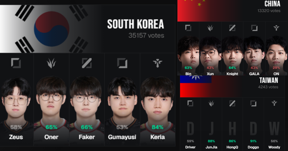首先最引人注目的就是「南韓隊」,在蒐集的 3 萬 5 千多票中竟湊齊「ZOFGK」組合,讓 Zeus、Oner、Faker、Gumayusi、Keria 再合體,其中在輔助選擇上 Keria 以 84% 成為五人得票率最高的。