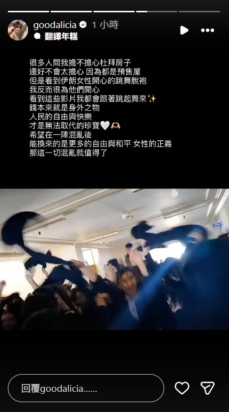 愛莉莎莎稍早在 Instagram Stories 表示,許多網友相當關切杜拜的房產,她首先回應:「看到伊朗女性開心地跳舞脫袍,我反而很為她們開心,看到這些影片我都會跟著跳起舞來。」認為錢乃身外之物,人民的自由與快樂才是無可取代的珍寶,隨後繼續站在女性的角度說:「希望在一陣混亂後,能換來的是更多的自由與和平、女性的正義,那這一切混亂就值得了。」