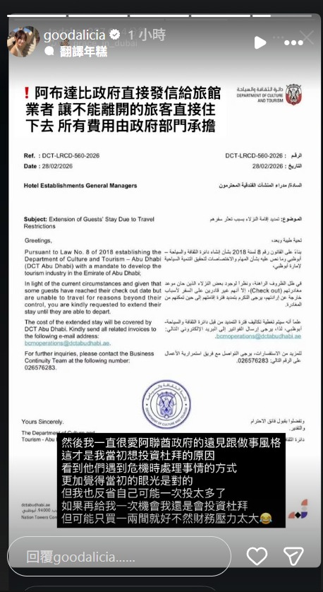 最後,她也不忘讚賞阿布達比政府對旅客的重視,說道政府直接發信給所有旅館業者,讓因為戰火受到抨擊的滯留旅客免費續住,所有費用全由政府部門負擔,令她更加確信該政府的做事風格既有效率且具有全面保障性。