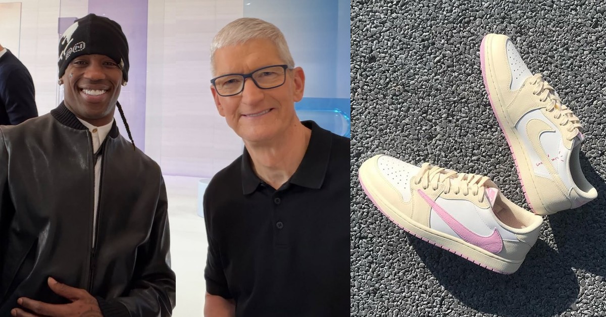 為即將到來的蘋果創立 50 週年里程碑,近日執行長 Tim Cook 親身參與紐約中央車站 Apple Store 舉辦的一場 Alicia Keys 驚喜表演,當天 Cook 上腳的 Travis Scott x Air Jordan 1 Low OG “Pink” 再度讓球鞋圈掀起熱議。