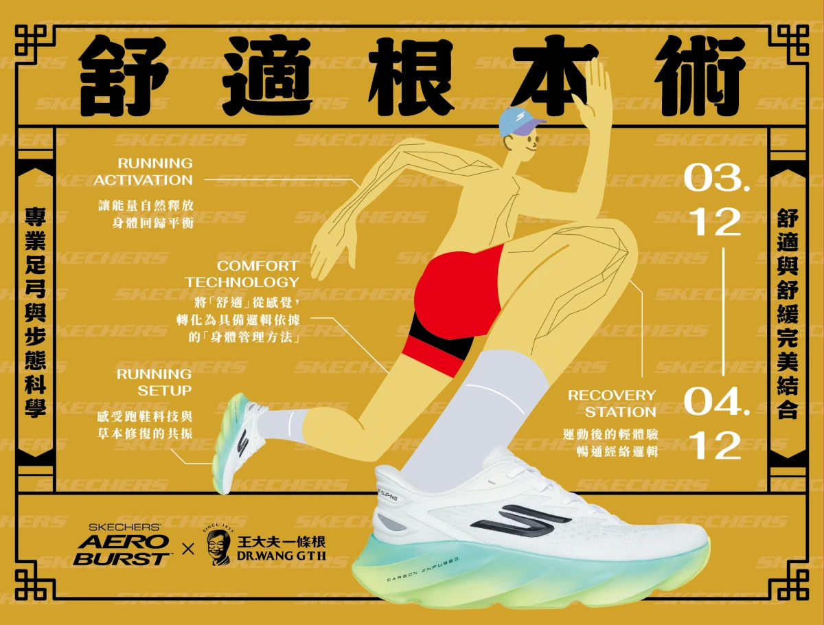 為了把跑後的舒適延伸到日常生活,SKECHERS 同步推出全台限定活動。3 月 12 日至 4 月 12 日期間,只要在指定門市購買 AERO 系列跑鞋或 GO WALK 系列健走鞋,即可獲得 SKECHERS × 王大夫一條根「舒適修復包」兌換券一張。前往永康街《舒適根本術》快閃店即可兌換,內容包含一條根貼倍靈貼布 2 片、躍動膏 3g、擦倍靈油膏 3g,以及一擦靈酸痛油膏 3g,數量有限送完為止。