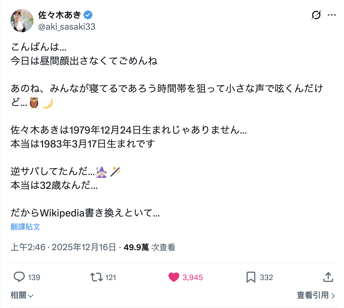 ▲ 佐々木あき 在 2025 年年底,坦白公開了自己的真實生日,為 1983 年的 3/17。