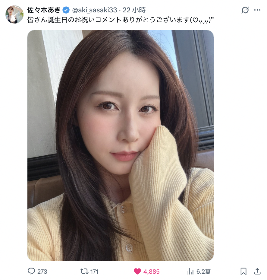 讓人驚喜的是,非但 “頂流要角”、”超新星” 們皆有所發揮,多位資深的人氣要角,也揭露了欣喜情報。因為時隔多年、並在 2025 年 11 月官宣重返藝能界的 佐々木あき,便於 3/18 喜迎了自己的「43歲」生日!當中,她除了 po 出自拍照、並在個人 X(Twitter)寫下 “皆さん誕生日のお祝いコメントありがとうございます(♡ᴗ͈ˬᴗ͈)”(意即:謝謝大家的生日祝福留言哦~(♡ᴗ͈ˬᴗ͈))” 話語,鑒於其圖像所顯露的「凍齡狀態」,就令粉絲們相繼大讚道 “完全不像 43″、”這顏值太逆天” 等等話語。