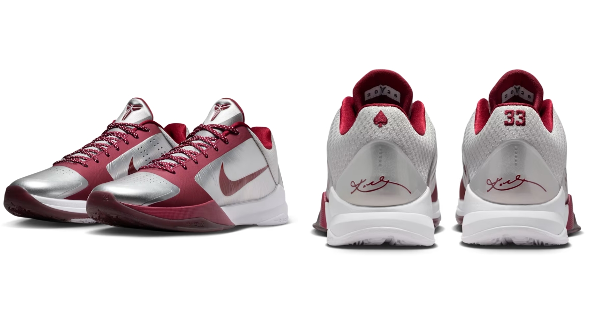 2026 年復刻版本延續 Metallic Silver 金屬銀鞋身搭配 White 中底與 Team Red 酒紅色細節的經典設計,同時在後跟加入全新元素:一側為 Ace 撲克牌標誌,另一側則印上 Kobe 高中時期的 33 球衣號碼,象徵他在 Lower Merion 的傳奇籃球歲月。