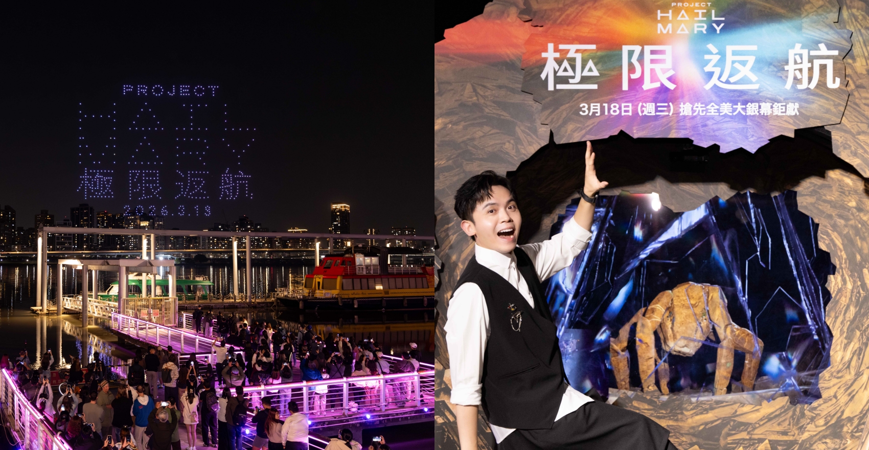 本次活動由好萊塢團隊親自來台執行,台灣更成為這場全球巡演的第一站。燈光秀將從台北出發,隨著故事軸線一路向西延伸至柏林與多倫多,三座城市接力上演無人機燈光表演,形成前所未見的全球串聯光影盛事。演出將以電影重要角色,同時也是男主角萊倫格雷斯的外星麻吉「洛基」為核心視覺主題,透過無人機在夜空中拼湊出太空船、星際旅程與角色形象,讓觀眾彷彿置身浩瀚宇宙。這場燈光秀也象徵【極限返航】故事中的星際旅程,電影描述國中科學老師萊倫格雷斯在距離地球數光年的太空船上醒來,肩負拯救太陽衰亡、拯救人類文明的重大任務。在孤獨宇宙中,他意外遇見來自外星文明的夥伴「洛基」,兩個來自不同星球的生命攜手合作,展開一場跨越文明的拯救世界行動。