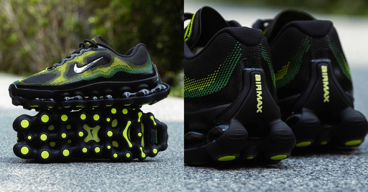 Nike Air Liquid Max 首發配色靈感源自於在大自然具有鮮明色彩的「箭毒蛙」,透過最新的奈米印花技術,呈現具有獨特科技感的時尚氛圍。首先,鞋面注入了三層立體印花工藝,觸感來說相當厚實,仔細看能發現黑色部分為鋸齒狀、帶有光澤的機能網布,另外綠色部分則為不同深淺構成的點線面圖騰,營造出幾何構成的視覺藝術。無論是配色運用還是圖案鋪陳,Air Liquid Max 都展現出強烈的未來氣息,進一步呼應 Air Max 系列一貫以來的科技語彙與創新形象。