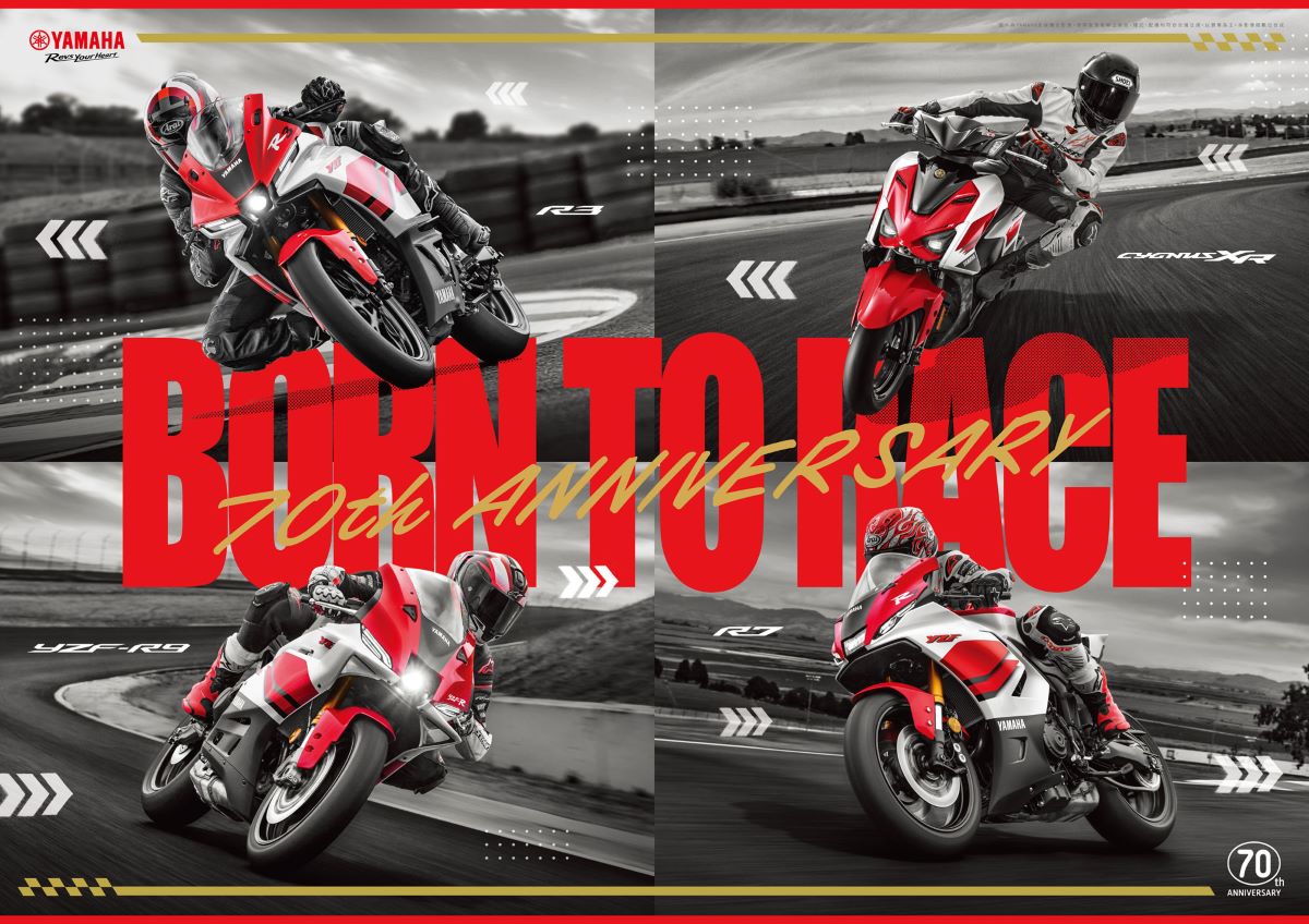 Yamaha 台灣山葉正式發布「70th Anniversary Edition」七十周年紀念車系,集結 CYGNUS XR、YZF-R3、YZF-R7 及旗艦跑車 YZF-R9,以經典紅白塗裝限量登台。更同步亮相2026年式的 YZF-R3 與 YZF-R7。